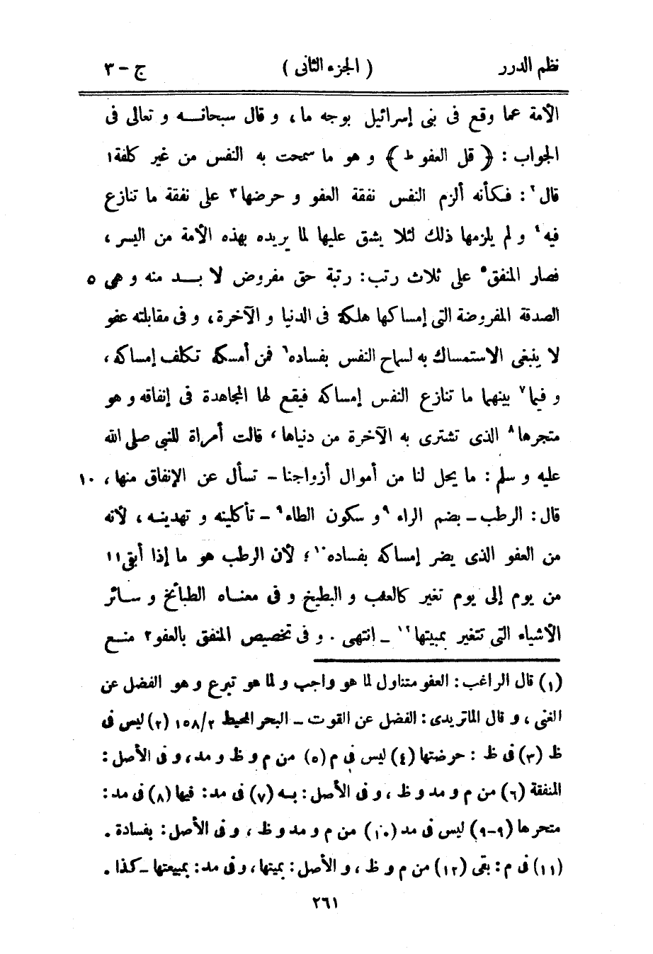 الأمة عما وقع في بني إسرائيل بوجه ما، وقال سبحانه وتعالى في الجواب: {قل العفو} وهو ما سمحت به النفس من غير كلفة قال: فكأنه ألزم النفس نفقة العفو وحرضها على نفقة ما تنازع فيه ولم يلزمها ذلك لئلا يشق عليها لما يريده بهذه الأمة من اليسر، فصار المنفق على ثلاث رتب: رتبة حق مفروض لا بد منه وهي الصدقة المفروضة التي إمساكها هلكة في الدنيا والآخرة، وفي مقابلته عفو لا ينبغي الاستمساك به لسماح النفس بفساده فمن أمسكه تكلف إمساكه، وفيما بينهما ما تنازع النفس إمساكه فيقع لها المجاهدة في إنفاقه وهو متجرها الذي تشتري به الآخرة من دنياها «قالت امرأة للنبي صَلَّى اللهُ عَلَيْهِ وَسَلَّمَ: ما يحل لنا من أموال أزواجنا - تسأل عن الإنفاق منها، قال: الرُطْب - بضم الراء وسكون الطاء - تأكلينه وتهدينه» لأنه من العفو الذي يضر إمساكه بفساده؛ لأن الرطب هو ما إذا أبقي ين يوم إلى يوم تغير كالعنب والبطيخ وفي معناه الطبائخ وسائر الأشياء التي تتغير بمبيتها - انتهى. وفي تخصيص المنفق بالعفو منع