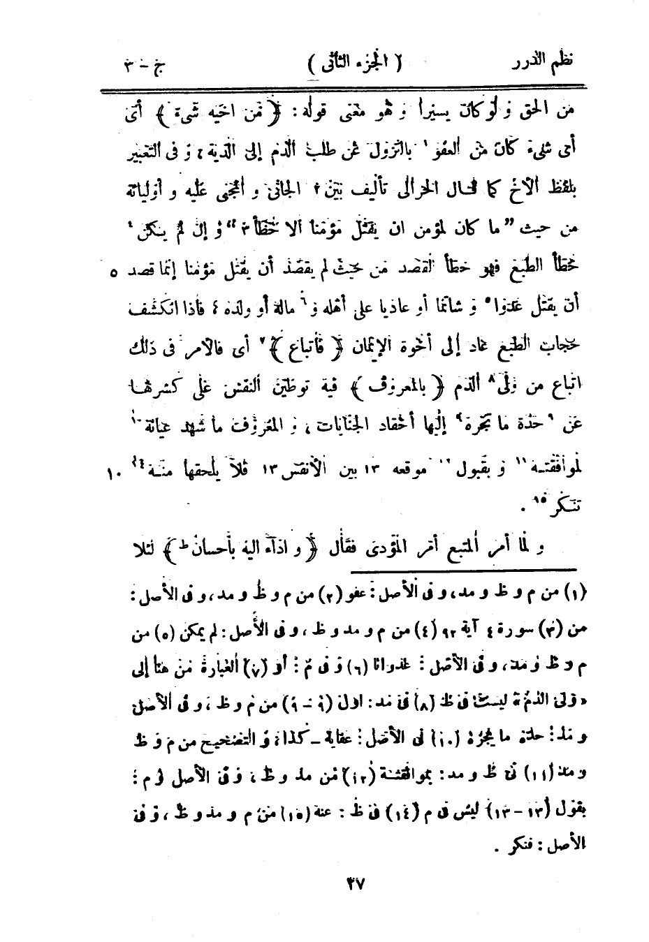 من الحق ولو كان يسيراً وهو معنى قوله: {من أخيه شيء} أي أي شيء كان من العفو بالنزول عن طلب الدم إلى الدية، وفي التعبير بلفظ الأخ كما قال الحرالي تأليف بين الجاني والمجني عليه وأوليائه من حيث {ما كان لمؤمن أن يقتل مؤمناً إلاّ خطأ} [النساء: 92] وإن لم يكن خطأ الطبع فهو خطأ القصد من حيث لم يقصد أن يقتل مؤمناً إنما قصد أن يقتل عدوّاً وشاتماً أو عادياً على أهله وماله أو ولده.