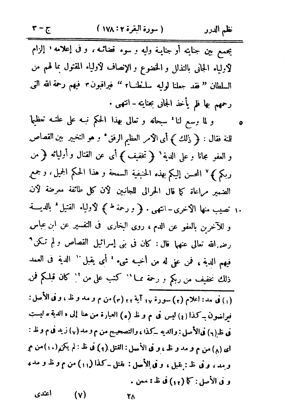 يجمع بين جنايته أو جناية وليه وسوء قضائه، وفي إعلامه إلزام لأولياء الجاني بالتذلل والخضوع والإنصاف لأولياء المقتول بما لهم من السلطان {فقد جعلنا لوليه سلطاناً} [الإسراء: 22] فيراقبون فيهم رحمة الله التي رحمهم بها فلم يأخذ الجاني بجنايته - انتهى.