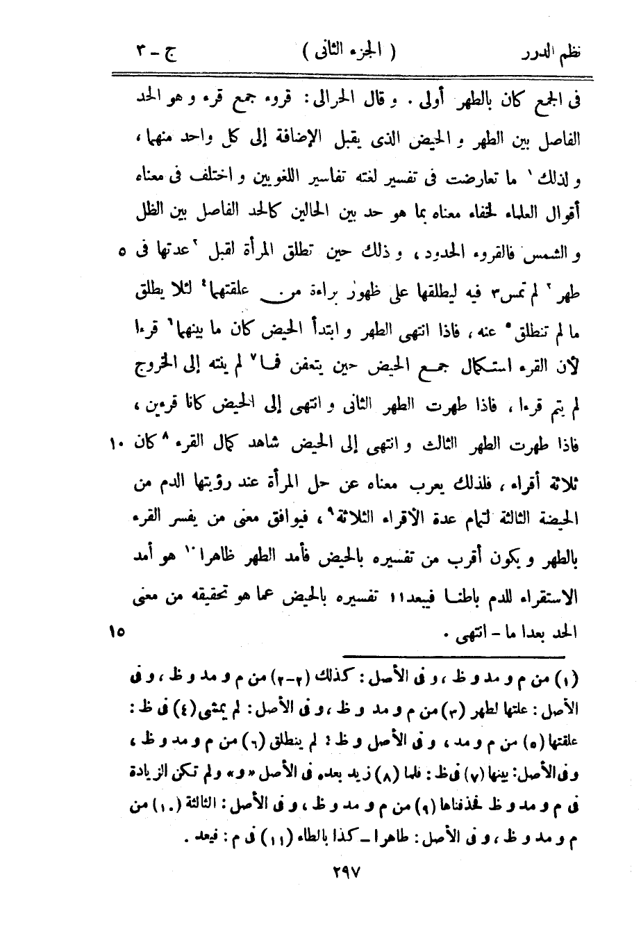 وقال الحرالي: قروء جمع قرء وهو الحد الفاصل بين الطهر والحيض الذي يقبل الإضافة إلى كل واحد منهما، ولذلك ما تعارضت في تفسير لغته تفاسير اللغويين واختلف في معناه أقوال العلماء لخفاء معناه بما هو حد بين الحالين كالحد الفاصل بين الظل والشمس فالقروء الحدود، وذلك حين تطلق المرأة لقبل عدتها في طهر لم تمس فيه ليطلقها على ظهور براءة من علقتهما لئلا يطلق ما لم تنطلق عنه، فإذا انتهى الطهر وابتدأ الحيض كان ما بينهما قرءاً لأن القرء استكمال جمع الحيض حين يتعفن فما لم ينته إلى الخروج لم يتم قرءاً، فإذا طهرت الطهر الثاني وانتهى إلى الحيض كانا قرءين، فإذا طهرت الطهر الثالث وانتهى إلى الحيض شاهد كمال القرء كان ثلاثة أقراء، فلذلك يعرب معناه عن حل المرأة عند رؤيتها الدم من الحيضة الثالثة لتمام عدة الأقراء الثلاثة، فيوافق معنى من يفسر القرء بالطهر ويكون أقرب من تفسيره بالحيض فأمد الطهر ظاهراً هو أمد الاستقراء للدم باطناً فيبعد تفسيره بالحيض عما هو تحقيقه من معنى الحد بعداً ما - انتهى.