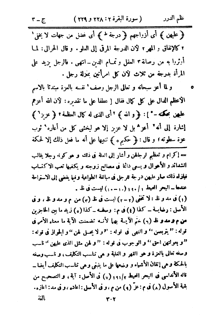 {عليهن} أي أزواجهم {درجة} أي فضل من جهات لا يخفى كالإنفاق والمهر لأن الدرجة المرقى إلى العلو. وقال الحرالي: لما أوثروا به من رصانة العقل وتمام الدين - انتهى. فالرجل يزيد على المرأة بدرجة من ثلاث لأن كل امرأتين بمنزلة رجل.