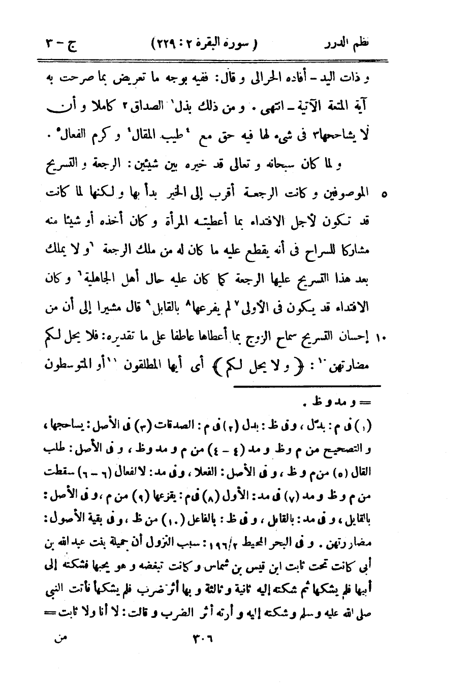 ولما كان سبحانه وتعالى قد خيره بين شيئين: الرجعة والتسريح الموصوفين وكانت الرجعة أقرب إلى الخير بدأ بها ولكنها لما كانت قد تكون لأجل الافتداء بما أعطيته المرأة وكان أخذه أو شيئاً منه مشاركاً للسراح في أنه يقطع عليه ما كان له من ملك الرجعة ولا يملك بعد هذا التسريح عليها الرجعة كما كان عليه حال أهل الجاهلية وكان الافتداء قد يكون في الأولى لم يفرعها بالقابل قال مشيراً إلى أن من إحسان التسريح سماح الزوج بما أعطاها عاطفاً على ما تقديره: فلا يحل لكم مضارتهن: {ولا يحل لكم} أي أيها المطلقون أو المتوسطون