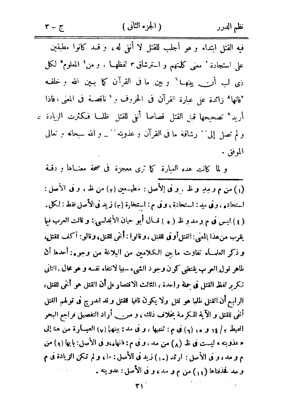 فيه القتل ابتداء وهو أجلب للقتل لا أنفى له، وقد كانوا مطبقين على استجادة معنى كلمتهم واسترشاق لفظها، ومن المعلوم لكل ذي لب أن بينها وبين ما في القرآن كما بين الله وخلقه فإنها زائدة على عبارة القرآن في الحروف وناقصة في المعنى، فإذا أريد تصحيحها قبل القتل قصاصاً أنفى للقتل ظلماً فكثرت الزيادة ولم تصل إلى رشاقة ما في القرآن وعذوبته - والله سبحانه وتعالى الموفق.