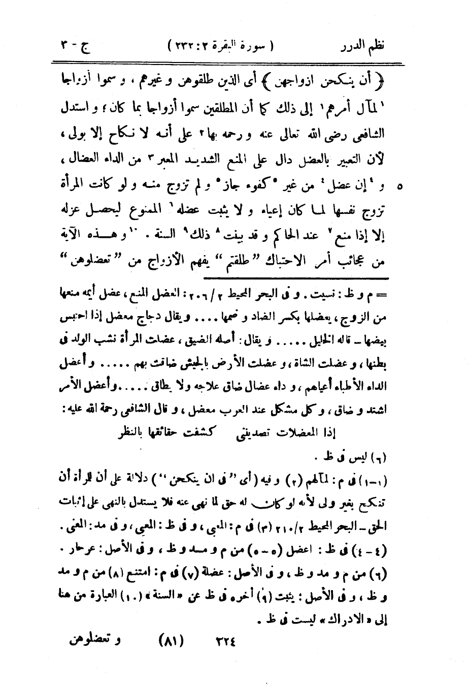 {أن ينكحن أزواجهن} أي الذين طلقوهن وغيرهم، وسموا أزواجاً لمآل أمرهم إلى ذلك كما أن المطلقين سموا أزواجاً بما كان؛ واستدل الشافعي رضي الله تعالى عنه ورحمه بها على أنه لا نكاح إلا بولي، لأن التعبير بالعضل دال على المنع الشديد المعبر من الداء العضال، وإن عضل من غير كفوء جاز ولم تزوج منه ولو كانت المرأة تزوج نفسها لما كان إعياء ولا يثبت عضله الممنوع ليحصل عزله إلا إذا منع عند الحاكم وقد بينت ذلك السنة. وهذه الآية من عجائب أمر الاحتباك {طلقتم} يفهم الأزواج من {تعضلوهن}