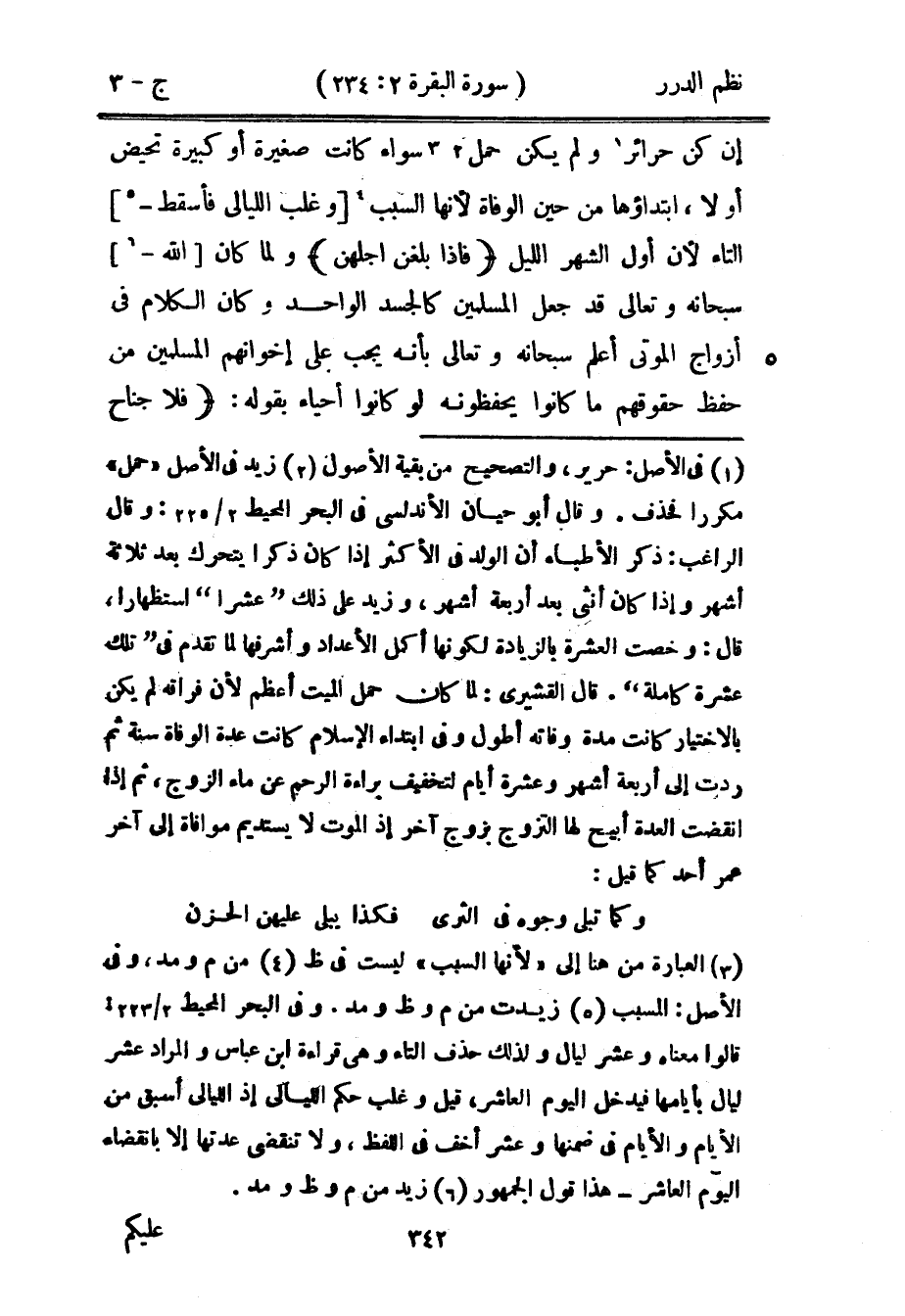 إن كن حرائر ولم يكن حمل سواء كانت صغيرة أو كبيرة تحيض أو لا، ابتداؤها من حين الوفاة لأنها السبب وغلب الليالي فأسقط التاء لأن أول الشهر الليل {فإذا بلغن أجلهن} ولما كان الله سبحانه وتعالى قد جعل المسلمين كالجسد الواحد وكان الكلام في أزواج الموتى أعلم سبحانه وتعالى بأنه يجب على إخوانهم المسلمين من حفظ حقوقهم ما كانوا يحفظونه لو كانوا أحياء بقوله: {فلا جناح