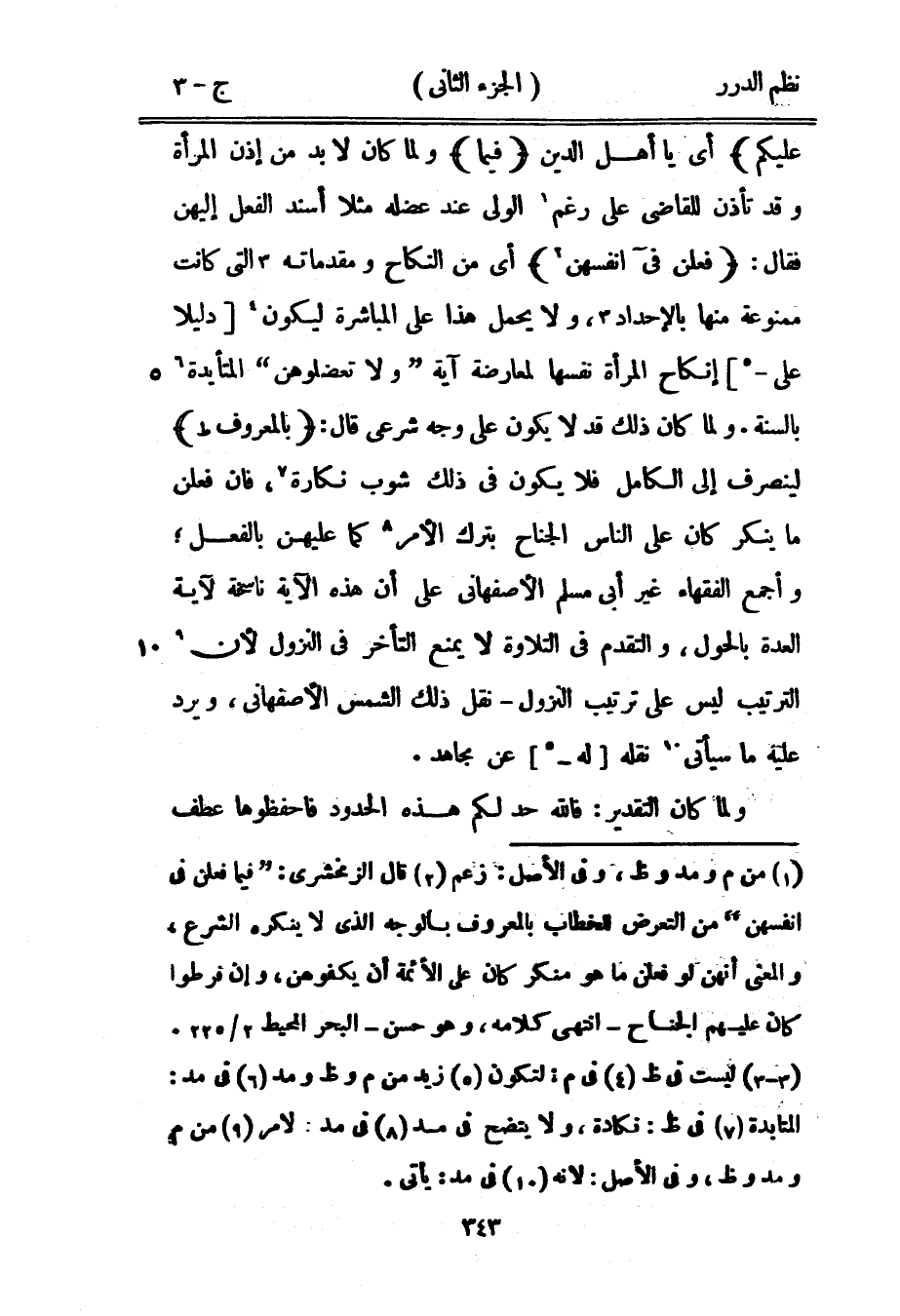 عليكم} أي يا أهل الدين {فيما} ولما كان لا بد من إذن المرأة وقد تأذن للقاضي على رغم الولي عند عضله مثلا أسند الفعل إليهن فقال: {فعلن في أنفسهن} أي من النكاح ومقدماته التي كانت ممنوعة منها بالإحداد، ولا يحمل هذا على المباشرة ليكون دليلاً على - إنكاح المرأة نفسها لمعارضة آية {ولا تعضلوهن} المتأيدة بالسنّة. ولما كان ذلك قد لا يكون على وجه شرعي قال: {بالمعروف} لينصرف إلى الكامل فلا يكون في ذلك شوب نكارة، فإن فعلن ما ينكر كان على الناس الجناح بترك الأمر كما عليهن بالفعل؛ وأجمع الفقهاء غير أبي مسلم الأصفهاني على أن هذه الآية ناسخة لآية العدة بالحول، والتقدم في التلاوة لا يمنع التأخر في النزول لأن الترتيب ليس على ترتيب النزول - نقل ذلك الشمس الأصفهاني، ويرد عليه ما سيأتي نقله له عن مجاهد.