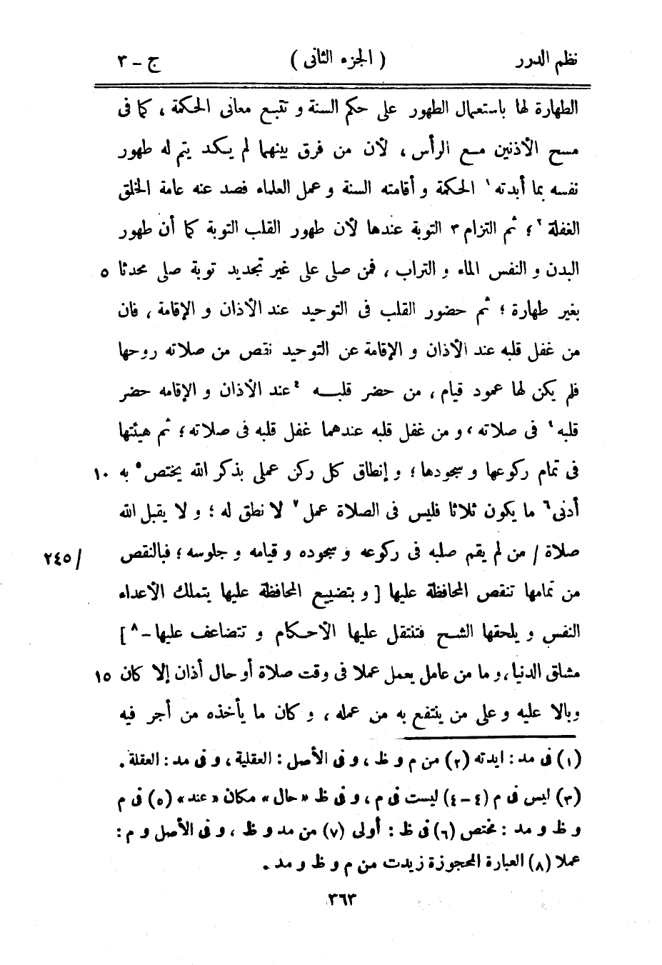 الطهارة لها باستعمال الطهور على حكم السنة وتتبع معاني الحكمة، كما في مسح الأذنين مع الرأس، لأن من فرق بينهما لم يكد يتم له طهور نفسه بما أبدته الحكمة وأقامته السنة وعمل العلماء فصد عنه عامة الخلق الغفلة؛ ثم التزام التوبة عندها لأن طهور القلب التوبة كما أن طهور البدن والنفس الماء والتراب، فمن صلى على غير تجديد توبة صلى محدثاً بغير طهارة؛ ثم حضور القلب في التوحيد عند الأذان والإقامة، فإن من غفل قلبه عند الأذان والإقامة عن التوحيد نقص من صلاته روحها فلم يكن لها عمود قيام، من حضر قلبه عند الأذان والإقامة حضر قلبه في صلاته، ومن غفل قلبه عندهما غفل قلبه في صلاته؛ ثم هيئتها في تمام ركوعها وسجودها؛ وإنطاق كل ركن عملي بذكر الله يختص به أدنى ما يكون ثلاثاً فليس في الصلاة عمل لا نطق له؛ ولا يقبل الله صلاة من لم يقم صلبه في ركوعه وسجوده وقيامه وجلوسه؛ فبالنقص من تمامها تنقص المحافظة عليها وبتضييع المحافظة عليها يتملك الأعداء النفس ويلحقها الشح فتنتقل عليها الأحكام وتتضاعف عليها مشاق الدنيا، وما من عامل يعمل عملاً في وقت صلاة أو حال أذان إلا كان وبالاً عليه وعلى من ينتفع به من عمله، وكان ما يأخذه من أجر فيه