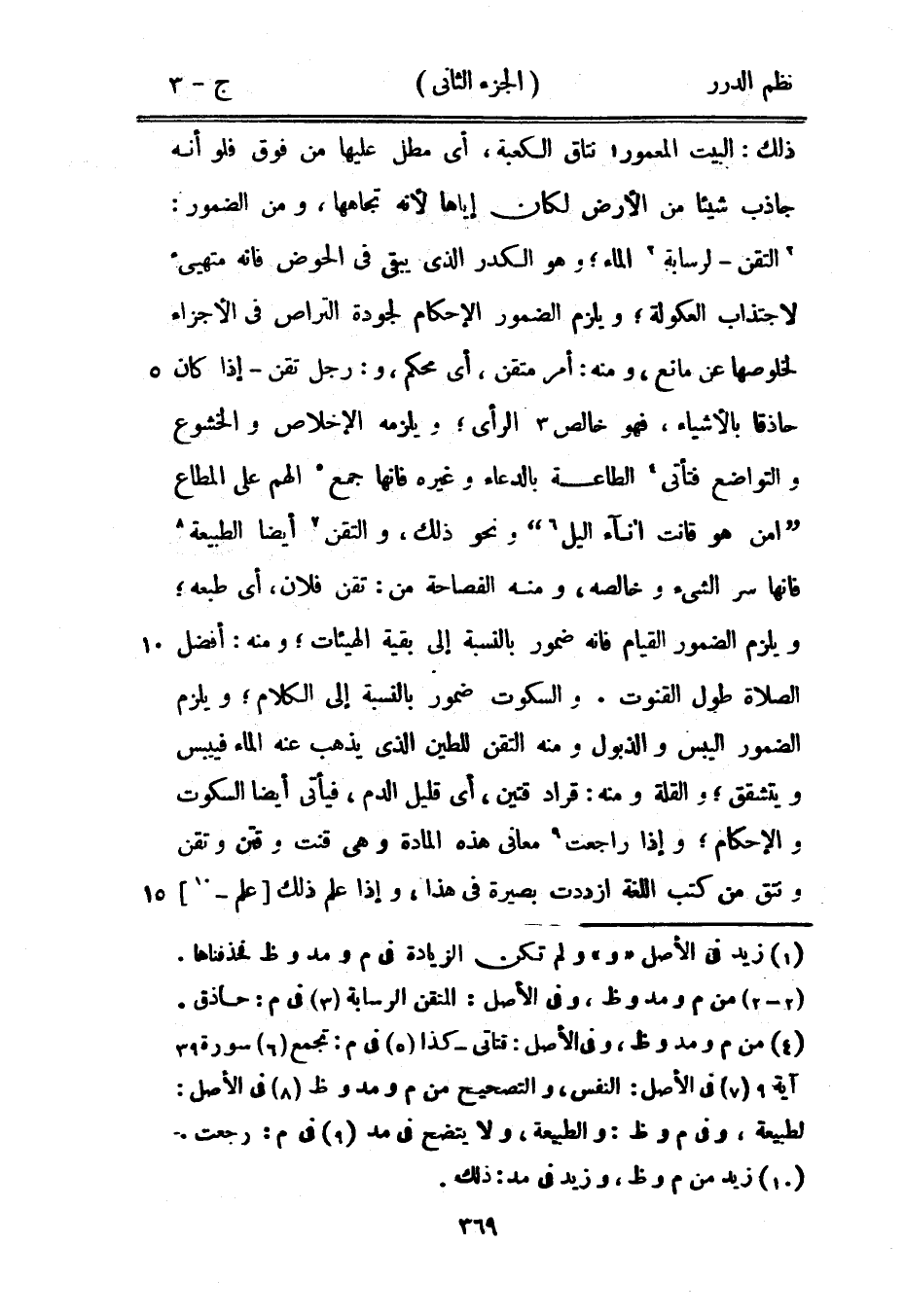 ذلك: البيت المعمور نتاق الكعبة، أي مطل عليها من فوق فلو أنه جاذب شيئاً من الأرض لكان إياها لأنه تجاهها، ومن الضمور: التقن - لرسابة الماء؛ وهو الكدر الذي يبقى في الحوض فإنه متهيىء لاجتذاب العكولة؛ ويلزم الضمور الإحكام لجودة التراص في الأجزاء لخلوصها عن مانع، ومنه: أمر متقن، أي محكم، و: رجل تقن - إذا كان حاذقاً بالأشياء، فهو خالص الرأي؛ ويلزمه الإخلاص والخشوع والتواضع فتأتي الطاعة بالدعاء وغيره فإنها جمع الهم على المطاع {أمَّن هو قانت آناء الليل} [الزمر: 9] ونحو ذلك، والتقن أيضاً الطبيعة فإنها سر الشيء وخالصه، ومنه الفصاحة من: تقن فلان، أي طبعه؛ ويلزم الضمور القيام فإنه ضمور بالنسبة إلى بقية الهيئات؛ ومنه: أفضل الصلاة طول القنوت.