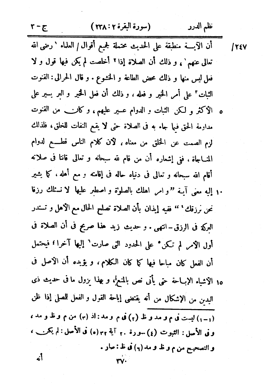 أن الآية منطبقة على الحديث محتملة لجميع أقوال العلماء رضي الله تعالى عنهم، وذلك أن الصلاة إذا أخلصت لم يكن فيها قول ولا فعل ليس منها وذلك محض الطاعة والخشوع. وقال الحرالي: القنوت الثبات على أمر الخير وفعله، وذلك أن فعل الخير والبر يسير على الأكثر ولكن الثبات والدوام عسير عليهم، وكان من القنوت مداومة الحق فيما جاء به في الصلاة حتى لا يقع التفات للخلق، فلذلك لزم الصمت عن الخلق من معناه، لأن كلام الناس قطع لدوام المناجاة، ففي إشعاره أن من قام لله سبحانه وتعالى قانتاً في صلاته أقام الله سبحانه وتعالى في دنياه حاله في إقامته ومع أهله، كما يشير إليه معنى آية {وأمر أهلك بالصلاة واصطبر عليها لا نسئلك رزقاً نحن نرزقك} [طه: 32] ففيه إيذان بأن الصلاة تصلح الحال مع الأهل وتستدر البركة في الرزق - انتهى. وحديث زيد هذا صريح في أن الصلاة في أول الأمر لم تكن على الحدود التي صارت إليها آخراً؛ فيحتمل أن الفعل كان مباحاً فيها كما كان الكلام، ويؤيده أن الأصل في الأشياء الإباحة حتى يأتي نص بالمنع، وبهذا يزول ما في حديث ذي اليدين من الإشكال من أنه يقتضي إباحة القول والفعل للمصلي إذا ظن
