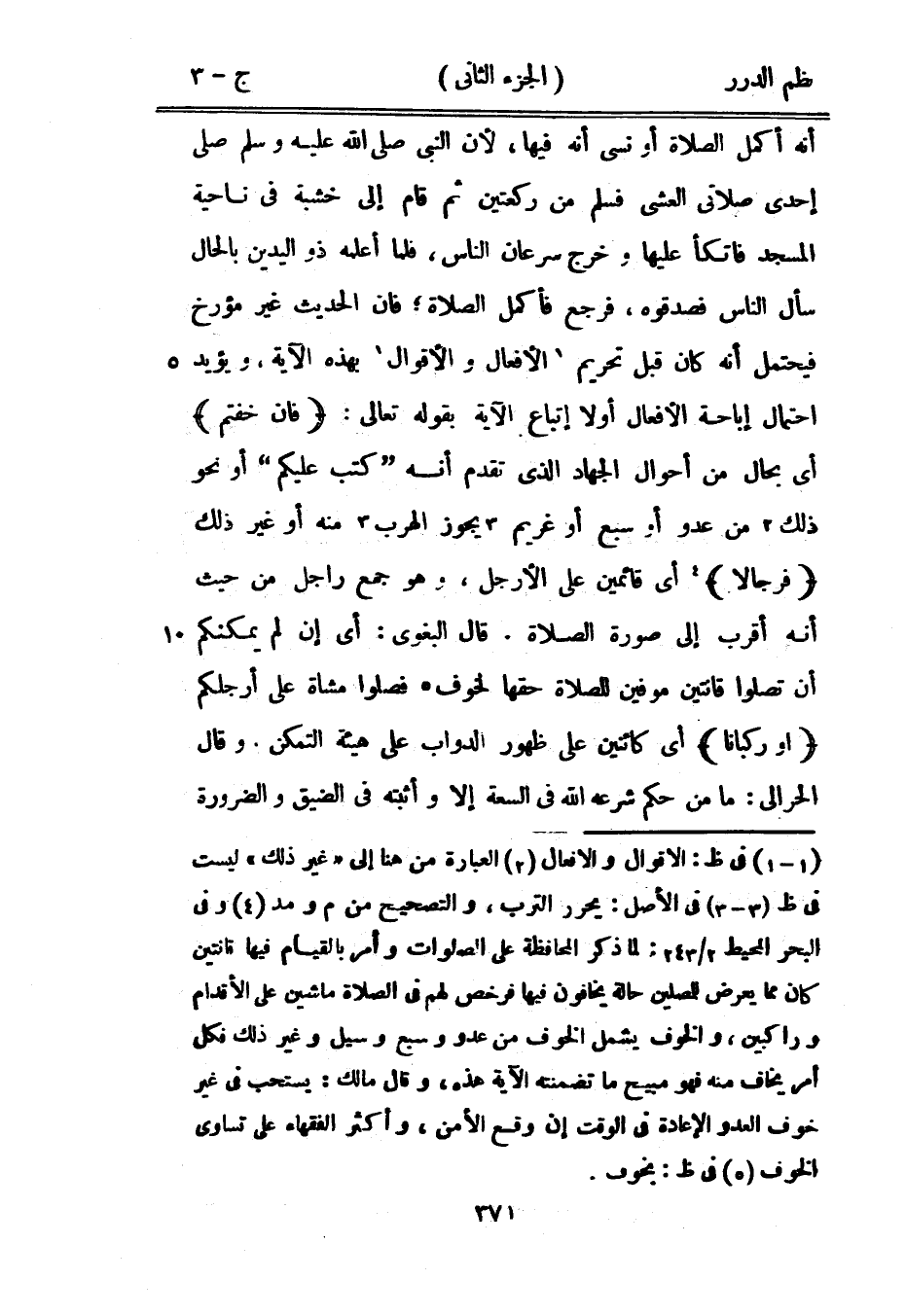 أنه أكمل الصلاة أو نسي أنه فيها، «لأن النبي صَلَّى اللهُ عَلَيْهِ وَسَلَّمَ صلى إحدى صلاتي العشي فسلم من ركعتين ثم قام إلى خشبة في ناحية المسجد فاتكأ عليها وخرج سرعان الناس، فلما أعلمه ذو اليدين بالحال سأل الناس فصدقوه، فرجع فأكمل الصلاة» فإن الحديث غير مؤرخ فيحتمل أنه كان قبل تحريم الأفعال والأقوال بهذه الآية. ويؤيد احتمال إباحة الأفعال أولاً اتباع الآية بقوله تعالى: {فإن خفتم} أي بحال من أحوال الجهاد الذي تقدم أنه {كتب عليكم} أو نحو ذلك من عدو أو سبع أو غريم يجوز الهرب منه أو غير ذلك {فرجالاً} أي قائمين على الأرجل، وهو جمع راجل من حيث إنه أقرب إلى صورة الصلاة. قال البغوي: أي إن لم يمكنكم أن تصلوا قانتين موفين للصلاة حقها لخوف فصلوا مشاة على أرجلكم {أو ركباناً} أي كائنين على ظهور الدواب على هيئة التمكن. وقال الحرالي: ما من حكم شرعه الله في السعة إلا وأثبته في الضيق والضرورة