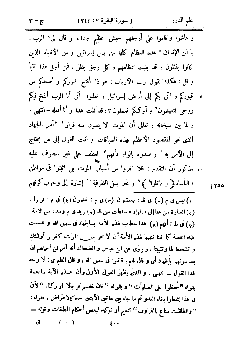 وعاشوا وقاموا على أرجلهم جيش عظيم جداً، وقال لي الرب: يا ابن الإنسان! هذه العظام كلها من بني إسرائيل ومن الأنبياء الذين كانوا يقتلون وقد بليت عظامهم وكل رجل بطل، فمن أجل هذا تنبأ وقل: هكذا يقول رب الأرباب: هو ذا أفتح قبوركم وأصعدكم من قبوركم وآتي بكم إلى أرض إسرائيل وتعلمون أني أنا الرب أنفخ فيكم روحي فتعيشون وأترككم تعملون؛ قد قلت هذا وأنا أفعله - انتهى. ولما بيّن سبحانه وتعالى أن الموت لا يصون منه فرار أمر بالجهاد الذي هو المقصود الأعظم بهذه السياقات ولفت القول إلى من يحتاج إلى الأمر به وصدره بالواو فأفهم العطف على غير معطوف عليه مذكور أن التقدير: فلا تفروا من أسباب الموت بل اثبتوا في مواطن البأساء {وقاتلوا} وعبر بفي الظرفية إشارة إلى وجوب كونهم