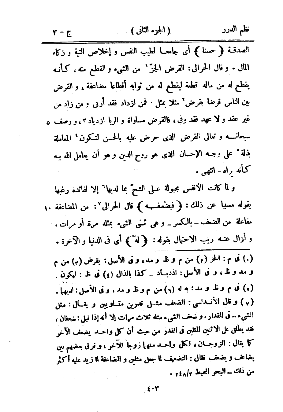الصدقة {حسناً} أي جامعاً لطيب النفس وإخلاص النية وزكاء المال. وقال الحرالي: القرض الجزّ من الشيء والقطع منه، كأنه يقطع له من ماله قطعة ليقطع له من ثوابه أقطاعاً مضاعفة، والقرض بين الناس قرضاً بقرض مثلاً بمثل فمن ازداد فقد أربى ومن زاد من غير عقد ولا عهد فقد وفى، فالقرض مساواة والربا ازدياد، ووصف سبحانه وتعالى القرض الذي حرض عليه بالحسن لتكون المعاملة بذلة على وجه الإحسان الذي هو روح الدين وهو أن يعامل الله به كأنه يراه - انتهى.
