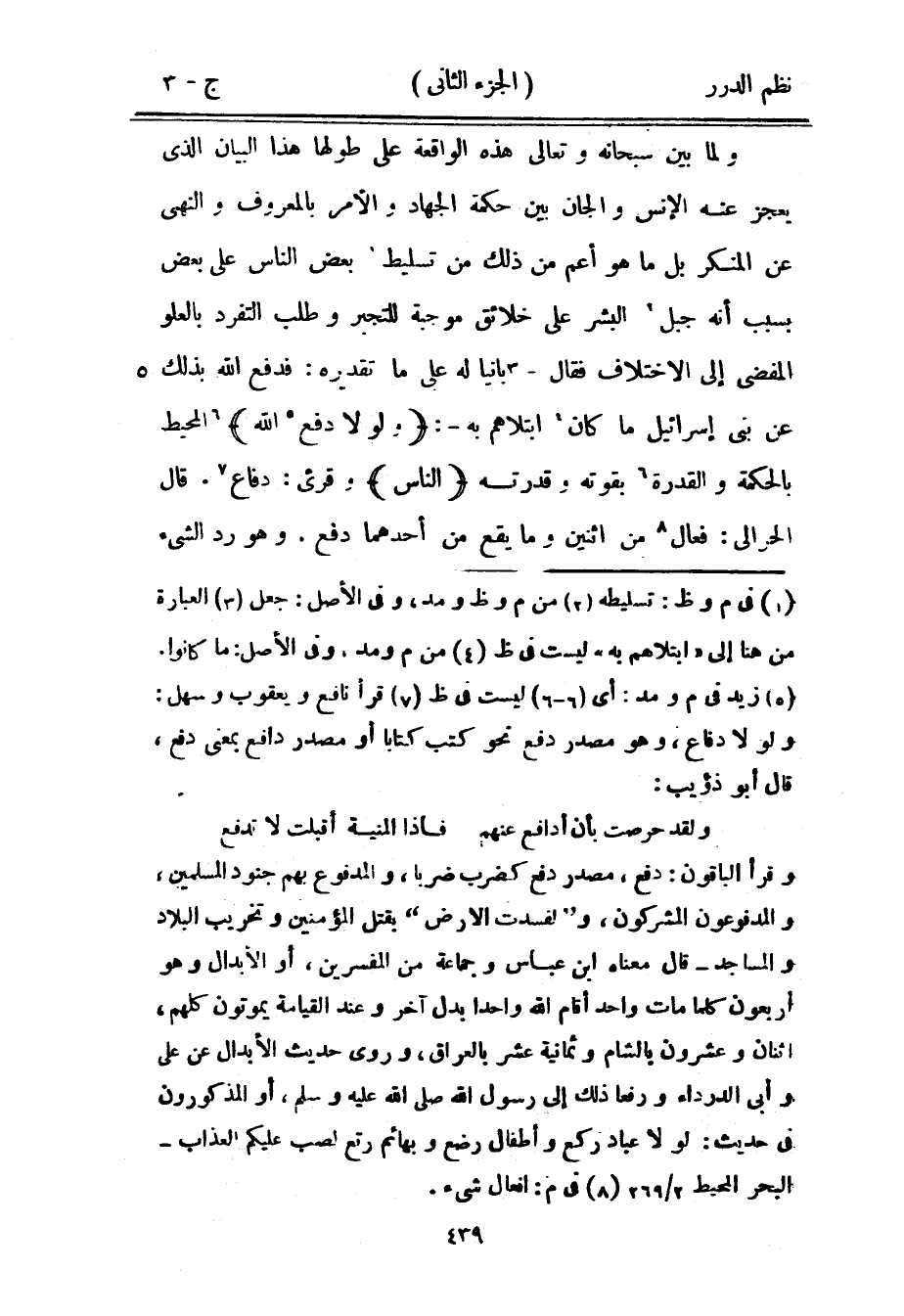 ولما بين سبحانه وتعالى هذه الواقعة على طولها هذا البيان الذي يعجز عنه الإنس والجان بين حكمة الجهاد والأمر بالمعروف والنهي عن المنكر بل ما هو أعم من ذلك من تسليط بعض الناس على بعض بسبب أنه جبل البشر على خلائق موجبة للتجبر وطلب التفرد بالعلو المفضي إلى الاختلاف فقال - بانياً له على ما تقديره: فدفع الله بذلك عن بني إسرائيل ما كان ابتلاهم به -: {ولولا دفع الله} المحيط بالحكمة والقدرة بقوته وقدرته {الناس} وقرىء: دفاع.