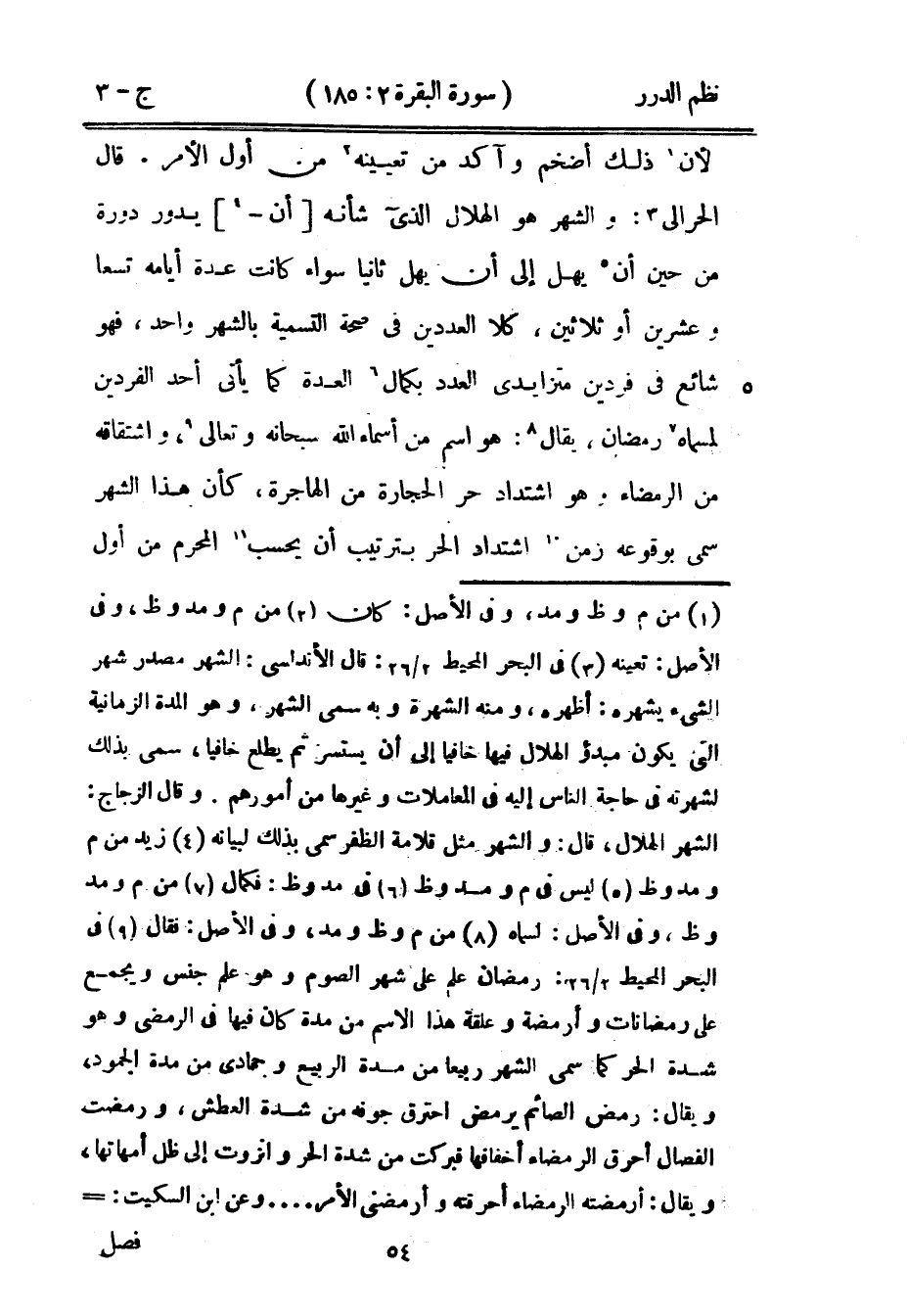 لأن ذلك أضخم وآكد من تعيينه من أول الأمر. قال الحرالي: والشهر هو الهلال الذي شأنه أن يدور دورة من حين أن يهل إلى أن يهل ثانياً سواء كانت عدة أيامه تسعاً وعشرين أو ثلاثين، كلا العددين في صحة التسمية بالشهر واحد، فهو شائع في فردين متزايدي العدد بكمال العدة كما يأتي أحد الفردين لمسماه رمضان، يقال: هو اسم من أسماء الله سبحانه وتعالى، واشتقاقه من الرمضاء وهو اشتداد حر الحجارة من الهاجرة، كأن هذا الشهر سمي بوقوعه زمن اشتداد الحر بترتيب أن يحسب المحرم من أول