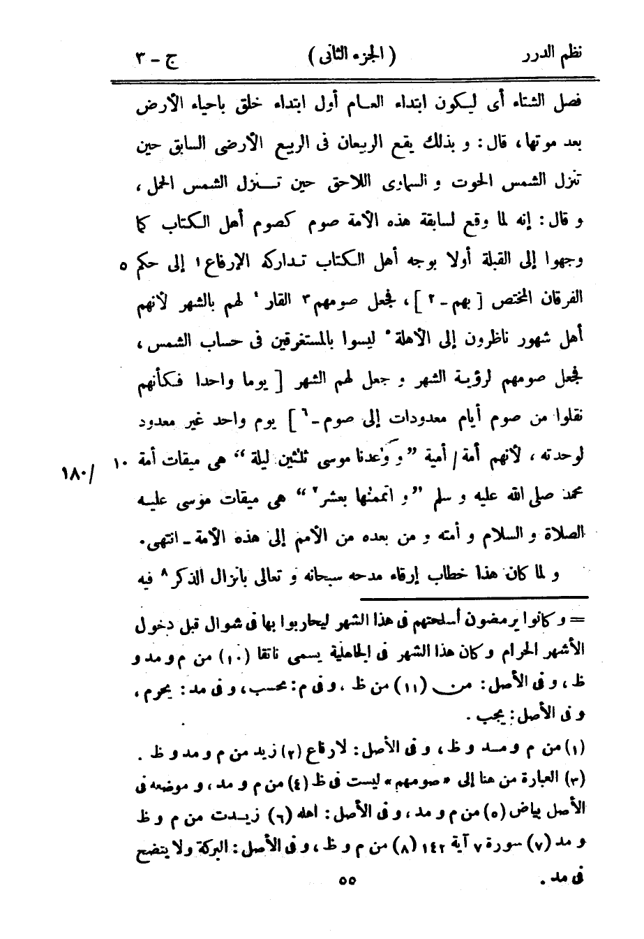 فصل الشتاء أي ليكون ابتداء العام أول ابتداء خلق بإحياء الأرض بعد موتها، قال: وبذلك يقع الربيعان في الربيع الأرضي السابق حين تنزل الشمس الحوت والسماوي اللاحق حين تنزل الشمس الحمل، وقال: إنه لما وقع لسابقة هذه الأمة صوم كصوم أهل الكتاب كما وجهوا إلى القبلة أولاً بوجه أهل الكتاب تداركه الإرفاع إلى حكم الفرقان المختص بهم، فجعل صومهم القار لهم بالشهر لأنهم أهل شهور ناظرون إلى الأهلة ليسوا بالمستغرقين في حساب الشمس، فجعل صومهم لرؤية الشهر وجعل لهم الشهر يوماً واحداً فكأنهم نقلوا من صوم أيام معدودات إلى صوم يوم واحد غير معدود لوحدته، لأنهم أمة أمية {وواعدنا موسى ثلاثين ليلة} [الأعراف: 142] هي ميقات أمة محمد صَلَّى اللهُ عَلَيْهِ وَسَلَّمَ {وأتممناها بعشر} [الأعراف: 142] هي ميقات موسى عليه الصلاة والسلام وأمته ومن بعده من الأمم إلى هذه الأمة - انتهى.