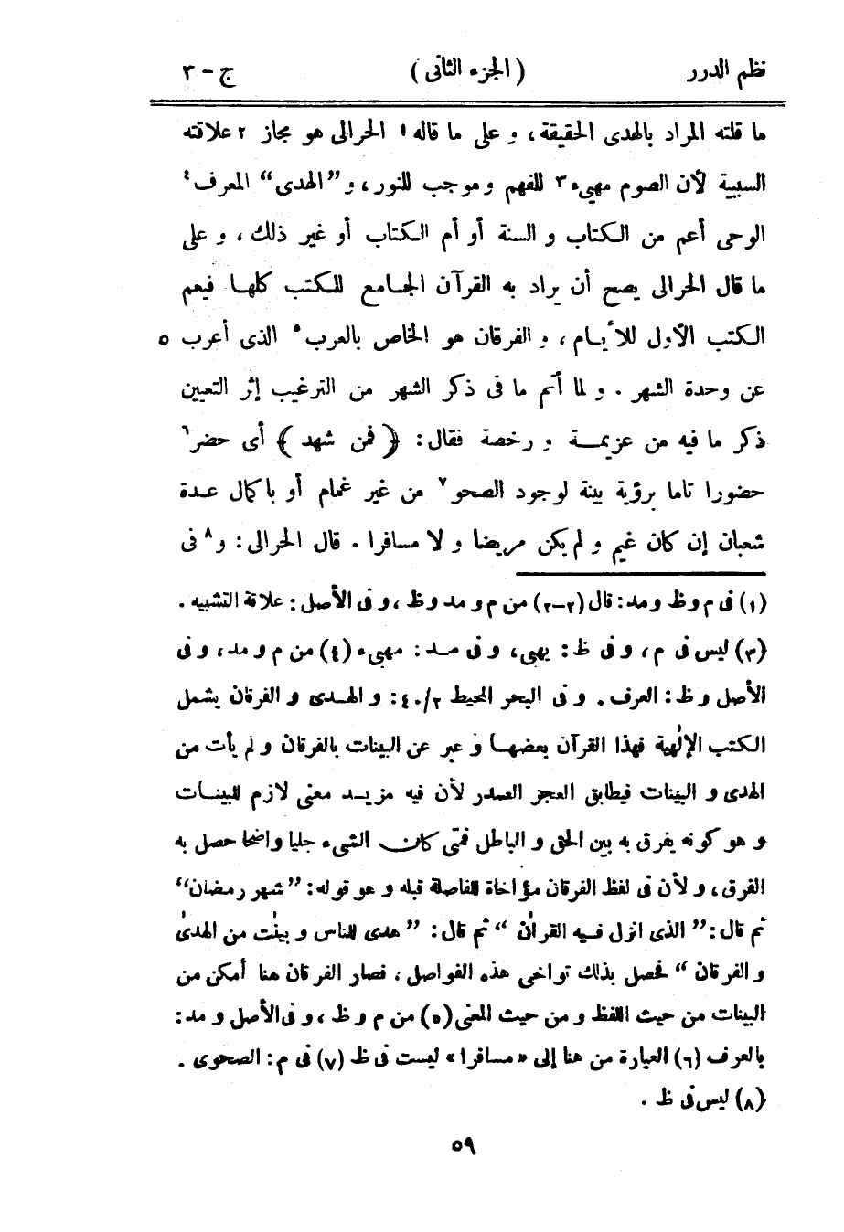 ما قلته المراد بالهدى الحقيقة، وعلى ما قاله الحرالي هو مجاز علاقته السببية لأن الصوم مهيىء للفهم وموجب للنور، {الهدى} المعرف الوحي أعم من الكتاب والسنة أو أم الكتاب أو غير ذلك، وعلى ما قال الحرالي يصح أن يراد به القرآن الجامع للكتب كلها فيعم الكتب الأول للأيام، والفرقان هو الخاص بالعرب الذي أعرب عن وحدة الشهر. ولما أتم ما في ذكر الشهر من الترغيب إثر التعيين ذكر ما فيه من عزيمة ورخصة فقال: {فمن شهد} أي حضر حضوراً تاماً برؤية بينة لوجود الصحو من غير غمام أو بإكمال عدة شعبان إن كان غيم ولم يكن مريضاً ولا مسافراً. قال الحرالي: وفي