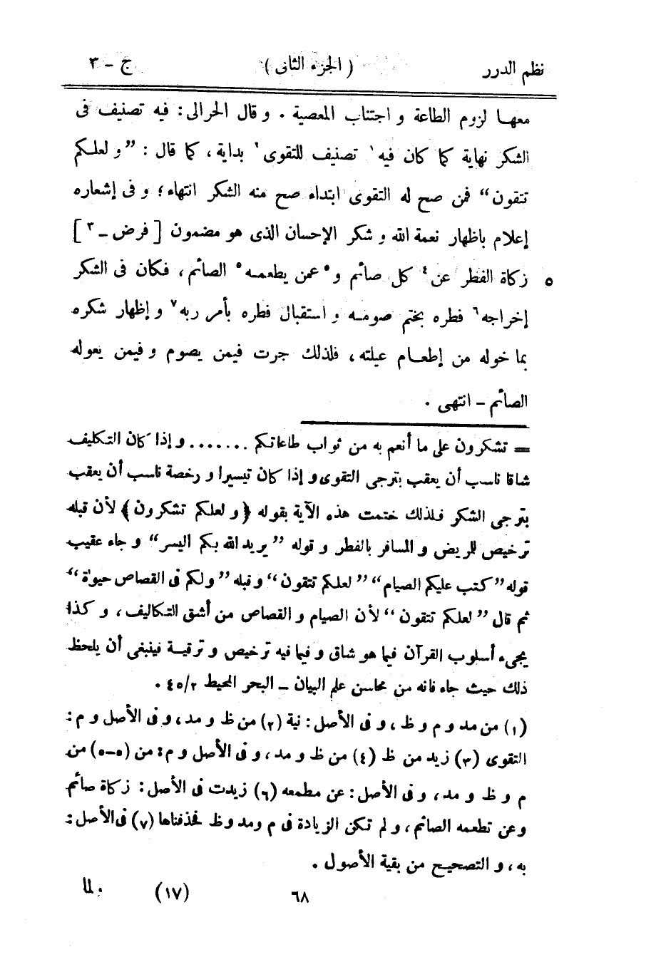 معها لزوم الطاعة واجتناب المعصية. وقال الحرالي: فيه تصنيف في الشكر نهاية كما كان فيه تصنيف للتقوى بداية، كما قال: {ولعلكم تتقون} فمن صح له التقوى ابتداء صح منه الشكر انتهاء؛ وفي إشعاره إعلام بإظهار نعمة الله وشكر الإحسان الذي هو مضمون فرض زكاة الفطر عن كل صائم وعمن يطعمه الصائم، فكان في الشكر إخراجه فطره بختم صومه واستقبال فطره بأمر ربه وإظهار شكره بما خوله من إطعام عيلته، فلذلك جرت فيمن يصوم وفيمن يعوله الصائم - انتهى.