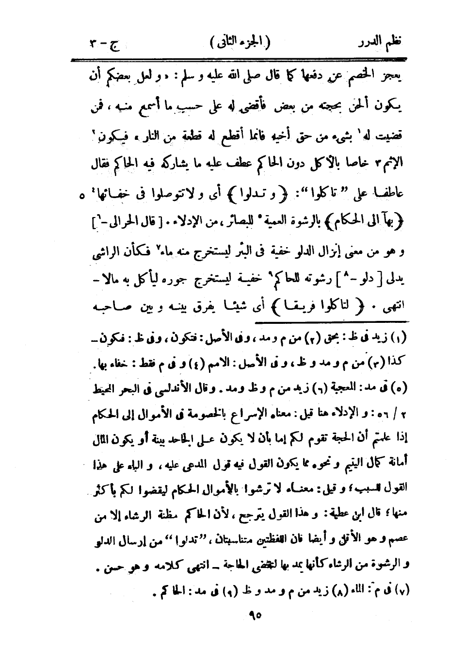 فيكون الإثم خاصاً بالأكل دون الحاكم عطف عليه ما يشاركه فيه الحاكم فقال عاطفاً على {تأكلوا} {وتدلوا} أي ولا تتواصلوا في خفائها {بها إلى الحكام} بالرشوة العمية للبصائر، من الإدلاء. قال الحرالي وهو من معنى إنزال الدلو خفية في البئر ليستخرج منه ماء فكأن الراشي يدلي دلو رشوته للحاكم خفية ليستخرج جوره ليأكل به مالاً - انتهى. {لتأكلوا فريقاً} أي شيئاً يفرق بينه وبين صاحبه