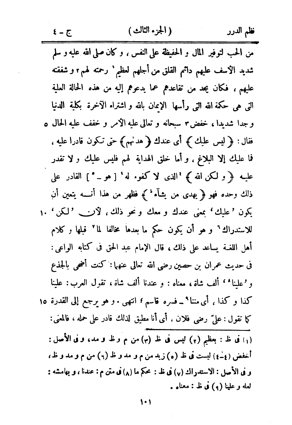 من الحب لتوفير المال والحفيظة على النفس، وكان صَلَّى اللهُ عَلَيْهِ وَسَلَّمَ شديد الأسف عليهم دائم القلق من أجلهم لعظيم رحمته لهم وشفقته عليهم، فكان يجد من تقاعدهم عما يدعوهم إليه من هذه الحالة العلية التي هي حكمة الله التي رأسها الإيمان بالله واشتراء الآخرة بكلية الدنيا وجداً شديداً، خفض سبحانه وتعالى عليه الأمر وخفف عليه الحال فقال: {ليس عليك} أي عندك {هداهم} حتى تكون قادراً عليه، فما عليك إلا البلاغ، وأما خلق الهداية لهم فليس عليك ولا تقدر عليه {ولكن الله} الذي لا كفوء له هو القادر على ذلك وحده فهو {يهدي من يشاء} فظهر من هذا أنه يتعين أن يكون عليك بمعنى عندك ومعك ونحو ذلك، لأن لكن للاستدراك وهو أن يكون حكم ما بعدها مخالفاً لما قبلها وكلام أهل اللغة يساعد على ذلك، قال الإمام عبد الحق في كتابه الواعي: في حديث عمران بن حصين رضي الله تعالى عنهما: كنت أضحي بالجذع وعلينا ألف شاة، معناه: وعندنا ألف شاة، تقول العرب: علينا كذا وكذا، أي مننا - فسره قاسم؛ انتهى. وهو يرجع إلى القدرة كما تقول: عليّ رضى فلان، أي أنا مطيق لذلك قادر على حمله، فالمعنى: