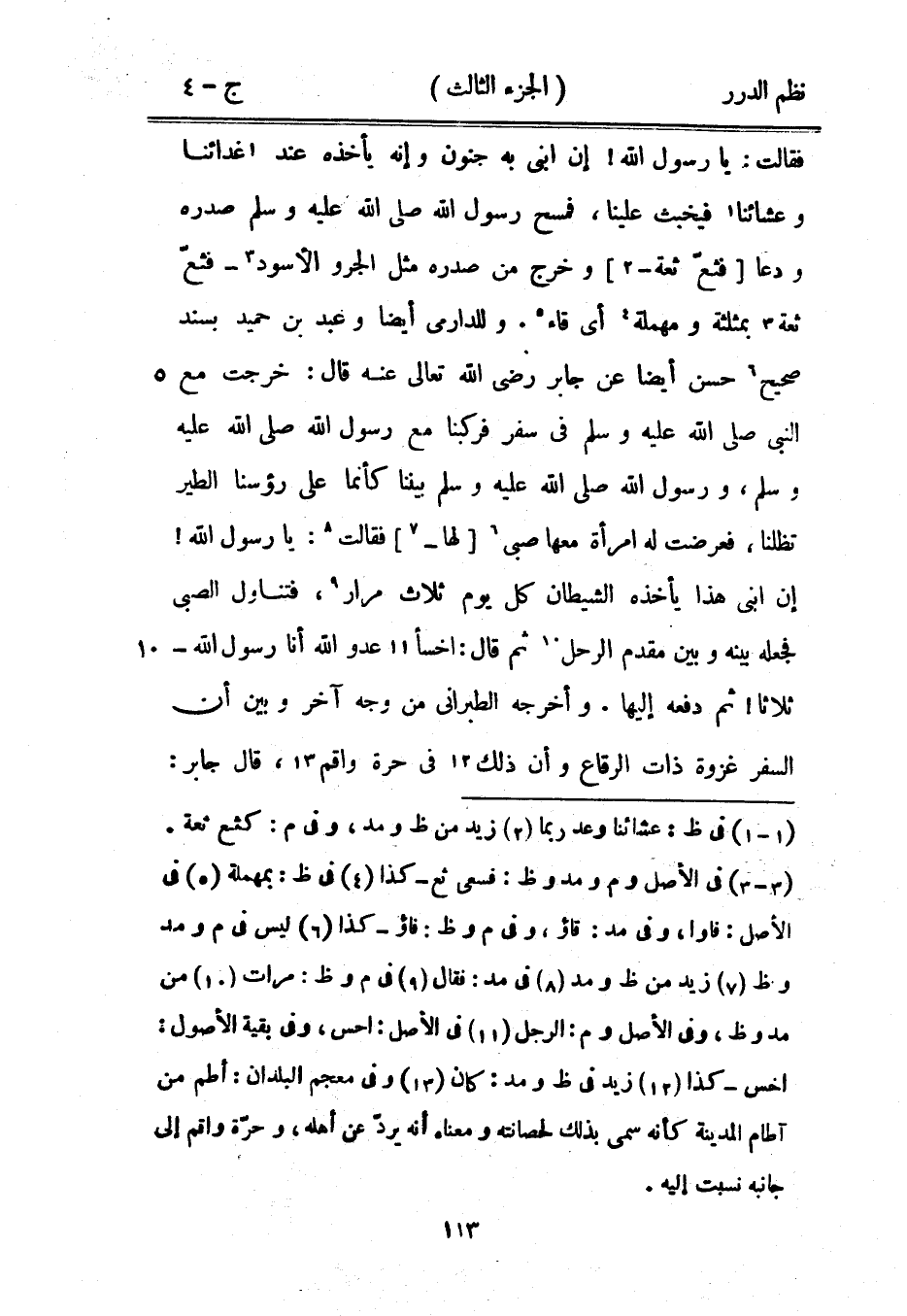 فقالت: يا رسول الله! إن ابني به جنون وإنه يأخذه عند أغدائنا وعشائنا فيخبث علينا، فمسح رسول الله صَلَّى اللهُ عَلَيْهِ وَسَلَّمَ صدره ودعا فثعّ ثعة وخرج من صدره مثل الجرو الأسود» فثعّ ثعة بمثلثة ومهملة أي قاء وللدارمي أيضاً وعبد بن حميد بسند صحيح حسن أيضاً عن جابر رضي الله تعالى عنه قال: «خرجت مع النبي صَلَّى اللهُ عَلَيْهِ وَسَلَّمَ في سفر فركبنا مع رسول الله صَلَّى اللهُ عَلَيْهِ وَسَلَّمَ، ورسول الله صَلَّى اللهُ عَلَيْهِ وَسَلَّمَ بيننا كأنما على رؤوسنا الطير تظلنا، فعرضت له امرأة معها صبي لها فقالت: يا رسول الله! إن ابني هذا يأخذه الشيطان كل يوم ثلاث مرار، فتناول الصبي فجعله بينه وبين مقدم الرحل ثم قال: اخسأ عدو الله أنا رسول الله ثلاثاً! ثم دفعه إليها» وأخرجه الطبراني من وجه آخر وبين أن السفر غزوة ذات الرقاع وأن ذلك في حرة واقم، قال جابر: «