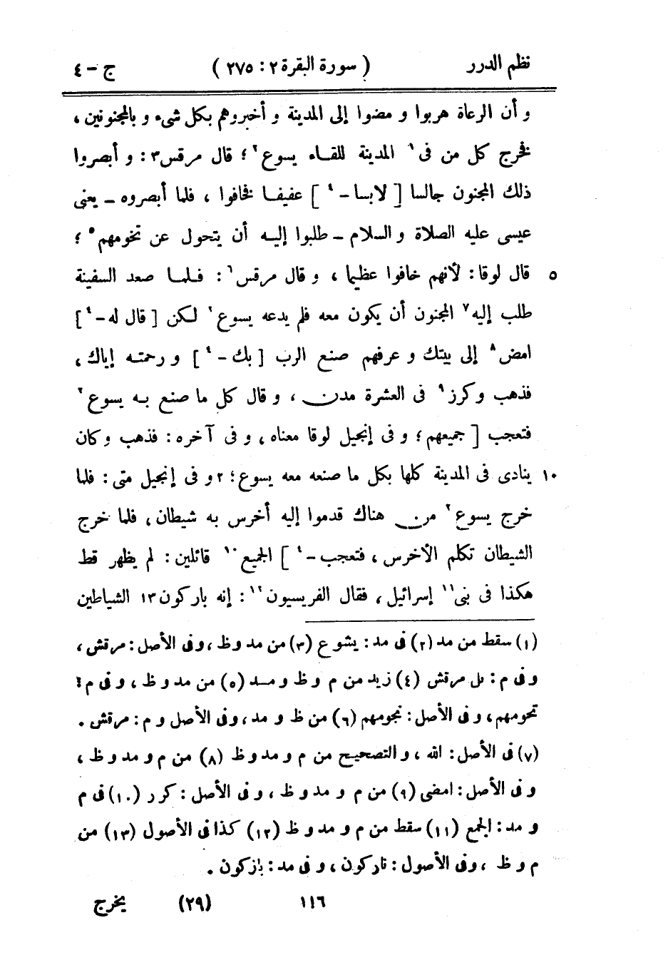 وأن الرعاة هربوا ومضوا إلى المدينة وأخبروهم بكل شيء وبالمجنونين، فخرج كل من في المدينة للقاء يسوع؛ قال مرقس: وأبصروا ذلك المجنون جالساً لابساً عفيفاً فخافوا، فلما أبصروه - يعني عيسى عليه الصلاة والسلام - طلبوا إليه أن يتحول عن تخومهم؛ قال لوقا: لأنهم خافوا عظيماً، وقال مرقس: فلما صعد السفينة طلب إليه المجنون أن يكون معه فلم يدعه يسوع لكن قال له امض إلى بيتك وعرفهم صنع الرب بك ورحمته إياك، فذهب وكرز في العشرة مدن، وقال كل ما صنع به يسوع فتعجب جميعهم؛ وفي إنجيل لوقا معناه، وفي آخره: فذهب وكان ينادي في المدينة كلها بكل ما صنعه معه يسوع؛ وفي إنجيل متى: فلما خرج يسوع من هناك قدموا إليه أخرس به شيطان، فلما خرج الشيطان تكلم الأخرس، فتعجب الجميع قائلين: لم يظهر قط هكذا في بني إسرائيل، فقال الفريسيون: إنه باركون الشياطين