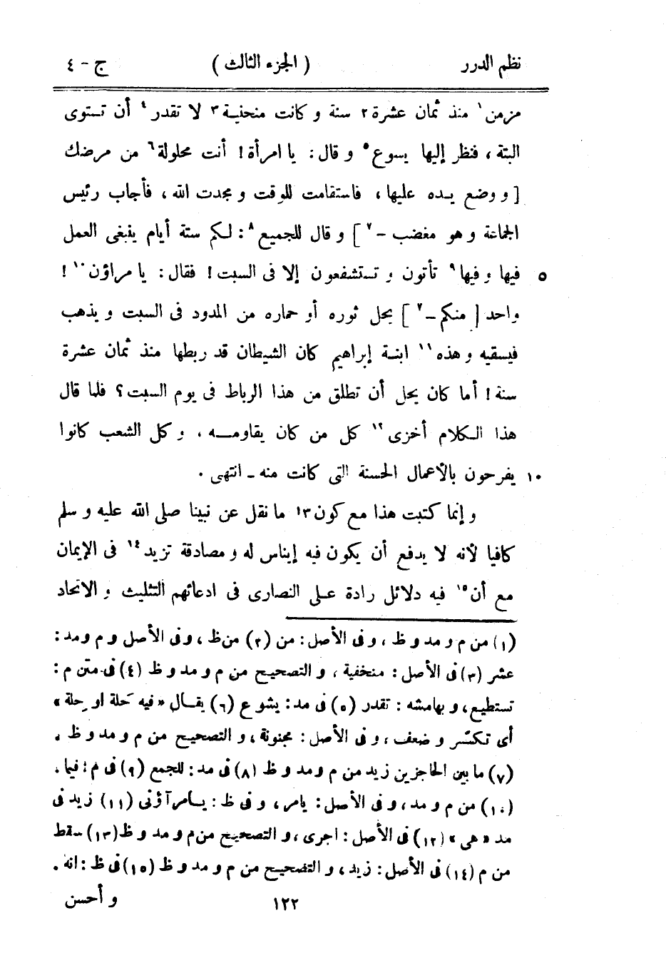 مزمن منذ ثمان عشرة سنة وكانت منحنية لا تقدر أن تستوي البتة، فنظر إليها يسوع وقال: يا امرأة! أنت محلولة من مرضك ووضع يده عليها، فاستقامت للوقت ومجدت الله، فأجاب رئيس الجماعة وهو مغضب وقال للجميع: لكم ستة أيام ينبغي العمل فيها وفيها تأتون وتستشفعون إلا في السبت! فقال: يا مراؤون! واحد منكم يحل ثوره أو حماره من المدود في السبت ويذهب فيسقيه وهذه ابنة إبراهيم كان الشيطان قد ربطها منذ ثمان عشرة سنة! أما كان يحل أن تطلق من هذا الرباط في يوم السبت؟ فلما قال هذا الكلام أخزى كل من كان يقاومه.