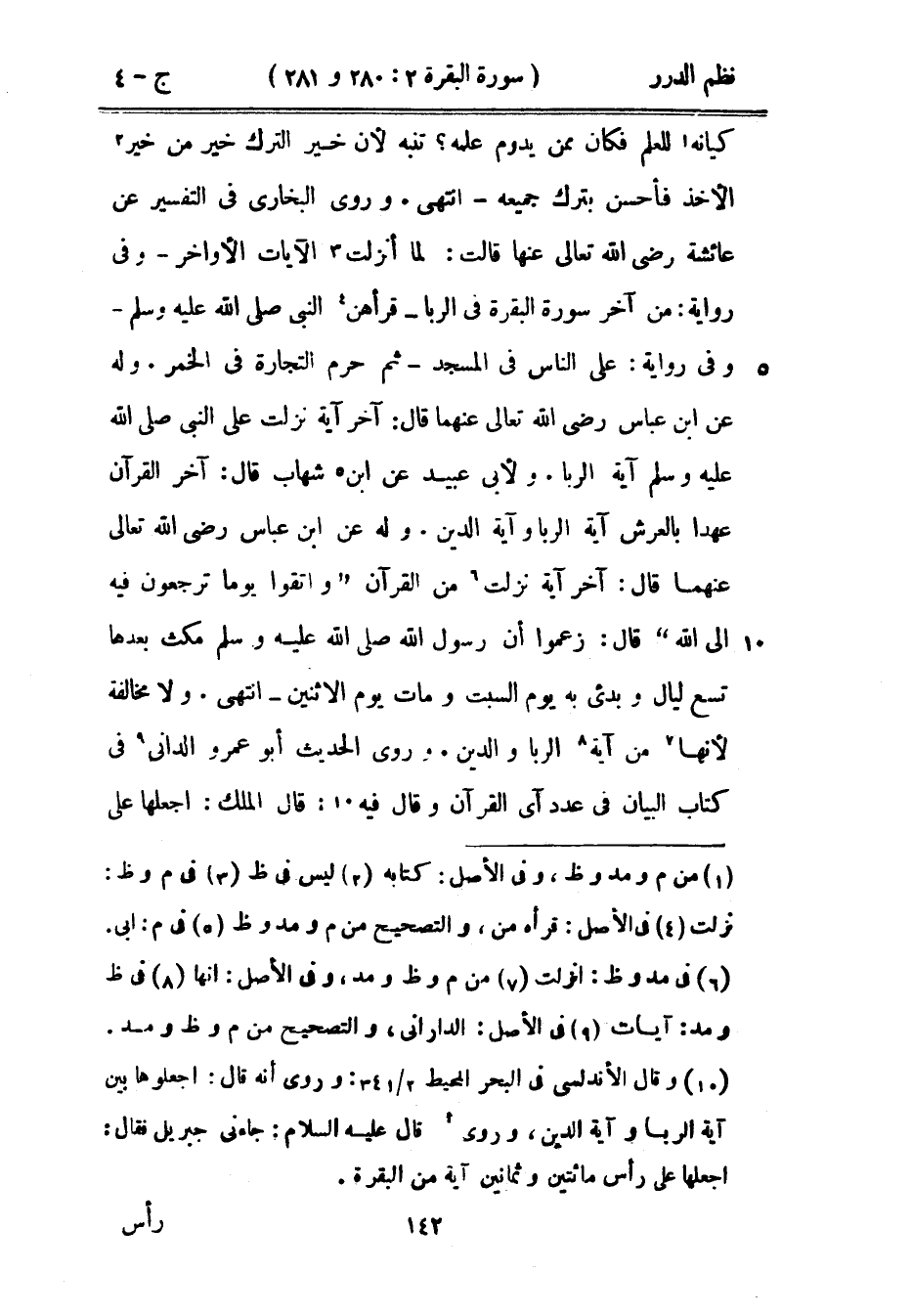 وروى البخاري في التفسير عن عائشة رضي الله تعالى عنها قالت: «لما أنزلت الآيات الأواخر - وفي رواية: من آخر سورة البقرة في الربا - قرأهن النبي صَلَّى اللهُ عَلَيْهِ وَسَلَّمَ وفي رواية: على الناس في المسجد - ثم حرم التجارة في الخمر» وله عن ابن عباس رضي الله تعالى عنهما قال: «آخر آية نزلت على النبي صَلَّى اللهُ عَلَيْهِ وَسَلَّمَ آية الربا» ولأبي عبيد عن ابن شهاب قال: آخر القرآن عهداً بالعرش آية الربا وآية الدين. وله عن ابن عباس رضي الله تعالى عنهما قال: آخر آية نزلت من القرآن {واتقوا يوماً ترجعون فيه إلى الله} [البقرة: 281] قال: زعموا أن رسول الله صَلَّى اللهُ عَلَيْهِ وَسَلَّمَ مكث بعدها تسع ليال وبدىء به يوم السبت ومات يوم الاثنين - انتهى. ولا مخالفة لأنها من آية الربا والدين. وروى الحديث أبو عمرو الداني في كتاب «البيان في عدد آي القرآن» وقال فيه: «قال الملك: اجعلها على