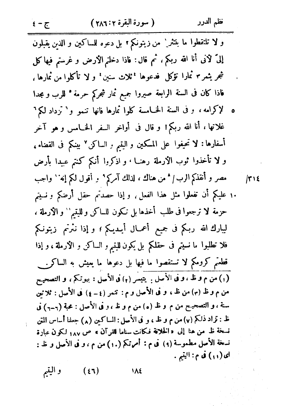ولا تلتقطوا ما ينتثر من زيتونكم بل دعوه للمساكين والذين يقبلون إليّ لأني أنا الله ربكم، ثم قال: فإذا دخلتم الأرض وغرستم فيها كل شجر يثمر ثماراً تؤكل فدعوها ثلاث سنين ولا تأكلوا من ثمارها، فإذا كان في السنة الرابعة صيروا جميع ثمار شجركم حرمة للرب ومجداً لإكرامه، وفي السنة الخامسة كلوا ثمارها فإنها تنمو وتزداد لكم غلاتها، أنا الله ربكم! وقال في أواخر السفر الخامس وهو آخر أسفارها: لا تحيفوا على المسكين واليتيم والساكن بينكم في القضاء، ولا تأخذوا ثوب الأرملة رهناً، واذكروا أنكم كنتم عبيداً بأرض مصر وأنقذكم الرب من هناك، لذلك آمركم وأقول لكم إنه واجب عليكم أن تفعلوا مثل هذا الفعل، وإذا حصدتم حقل أرضكم ونسيتم حزمة لا ترجعوا في طلب أخذها بل تكون للساكن ولليتيم والأرملة، ليبارك الله ربكم في جميع أعمال أيديكم؛ وإذا نثرتم زيتونكم فلا تطلبوا ما نسيتم في حقلكم بل يكون لليتيم والساكن والأرملة؛ وإذا قطعتم كرومكم لا تستقصوا ما فيها بل دعوها ما يعيش به الساكن