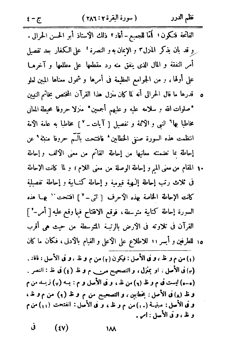 وقد بان بذكر المنزل والإيمان به والنصرة على الكفار بعد تفصيل أمر النفقة والمال الذي ينفق منه رد مقطعها على مطلعها وآخرها على أولها، ومن الجوامع العظيمة في أمرها وشمول معناها المبين لعلو قدرها ما قال الحرالي إنه لما كان منزل هذا القرآن المختص بخاتم النبيين صلوات الله وسلامه عليه وعليهم أجمعين منزلاً حروفاً محيطة المعاني مخاطباً بها النبي والأئمة وتفصيل آيات مخاطباً به عامة الأمة انتظمت هذه السورة صنفي الخطابين فافتتحت بالم حروفاً منبئة عن إحاطة بما تضمنته معانيها من إحاطة القائم من معنى الألف وإحاطة المقام من معنى الميم وإحاطة الوصلة من معنى اللام؛ ولما كانت الإحاطة في ثلاث رتب إحاطة إلهية قيومية وإحاطة كتابية وإحاطة تفصيلية كانت الإحاطة الخاصة بهذه الأحرف التي افتتحت بها هذه السورة إحاطة كتابية متوسطة، فوقع الافتتاح فيما وقع عليه أمر القرآن في تلاوته في الأرض بالرتبة المتوسطة من حيث هي أقرب للطرفين وأيسر للاطلاع على الأعلى والقيام بالأدنى، فكان ما كان