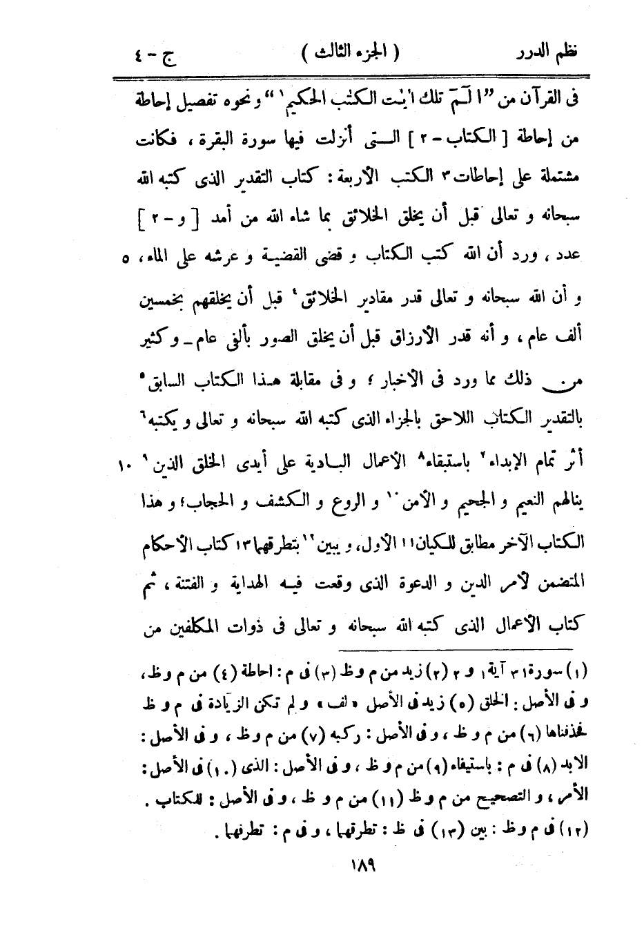 في القرآن من {الم تلك آيات الكتاب الحكيم} [لقمان: 26] ونحوه تفصيل إحاطة من إحاطة الكتاب التي أنزلت فيها سورة البقرة، فكانت مشتملة على إحاطات الكتب الأربعة: كتاب التقدير الذي كتبه الله سبحانه وتعالى قبل أن يخلق الخلائق بما شاء الله من أمد وعدد، ورد «أن الله كتب الكتاب وقضى القضية وعرشه على الماء» ، و «أن الله سبحانه وتعالى قدر مقادير الخلائق قبل أن يخلقهم بخمسين ألف عام» وأنه قدر الأرزاق قبل أن يخلق الصور بألفي عام - وكثير من ذلك مما ورد في الأخبار؛ وفي مقابلة هذا الكتاب السابق بالتقدير الكتاب اللاحق بالجزاء الذي كتبه الله سبحانه وتعالى ويكتبه أثر تمام الإبداء باستبقاء الأعمال البادية على أيدي الخلق الذين ينالهم النعيم والجحيم والأمن والروع والكشف والحجاب؛ وهذا الكتاب الآخر مطابق للكيان الأول، ويبين بتطرقهما كتاب الأحكام المتضمن لأمر الدين والدعوة الذي وقعت فيه الهداية والفتنة، ثم كتاب الأعمال الذي كتبه الله سبحانه وتعالى في ذوات المكلفين من