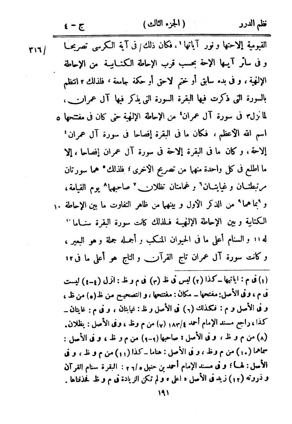 القيومية إلاحتها ونور آياتها، فكان ذلك في آية الكرسي تصريحاً وفي سائر آيها الإحة بحسب قرب الإحاطة الكتابية من الإحاطة الإلهية، وفي بدء سابق أو ختم لاحق أو حكمة جامعة، فلذلك انتظم بالسورة التي ذكرت فيها البقرة السورة التي يذكر فيها آل عمران، لما نزل في سورة آل عمران من الإحاطة الإلهية حتى كان في مفتتحها اسم الله الأعظم، فكان ما في البقرة إفصاحاً في سورة آل عمران إلاحة، وكان ما في البقرة إلاحة في سورة آل عمران إفصاحاً، إلا ما اطلع في كل واحدة منهما من تصريح الأخرى؛ فلذلك هما سورتان مرتبطتان وغيايتان وغمامتان تظلان صاحبهما يوم القيامة، وبما هما من الذكر الأول وبينهما من ظاهر التفاوت ما بين الإحاطة الكتابية وبين الإحاطة الإلهية فلذلك كانت سورة البقرة سناماً له والسنام أعلى ما في الحيوان المنكب وأجمله جملة وهو البعير، وكانت سورة آل عمران تاج القرآن والتاج هو أعلى ما في