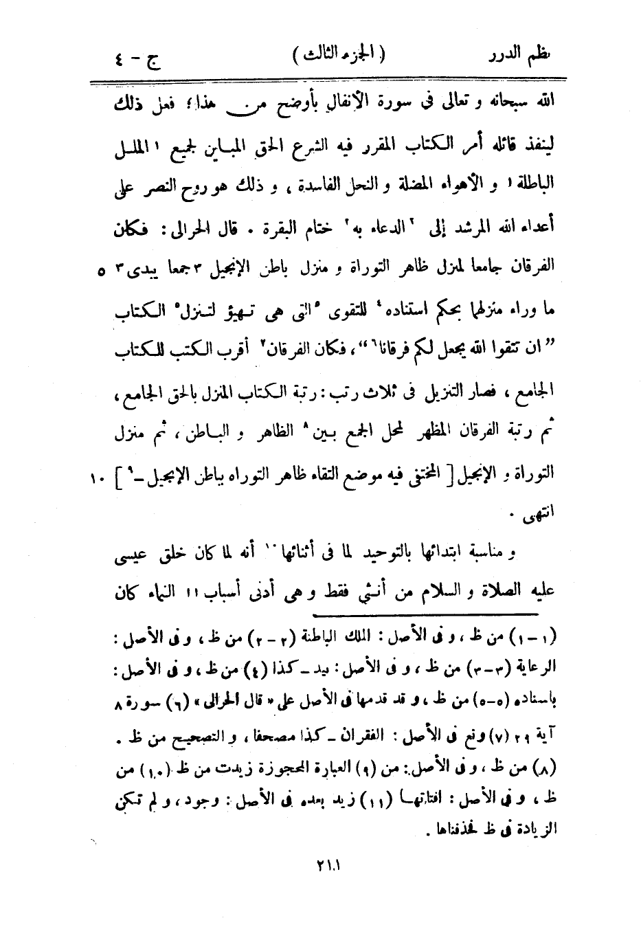 الله سبحانه وتعالى في سورة الأنفال بأوضح من هذا؛ فعل ذلك لينفذ قائله أمر الكتاب المقرر فيه الشرع الحق المباين لجميع الملل الباطلة والأهواء المضلة والنحل الفاسدة، وذلك هو روح النصر على أعداء الله المرشد إلى الدعاء به ختام البقرة. قال الحرالي: فكان الفرقان جامعاً لمنزل ظاهر التوراة ومنزل باطن الإنجيل جمعاً يبدي ما وراء منزلهما بحكم استناده للتقوى التي هي تهيؤ لتنزل الكتاب {إن تتقوا الله يجعل لكم فرقانا} [الانفال: 29] فكان الفرقان أقرب الكتب للكتاب الجامع، فصار التنزيل في ثلاث رتب: رتبة الكتاب المنزل بالحق الجامع، ثم رتبة الفرقان المظهر لمحل الجمع بين الظاهر والباطن، ثم منزل التوراة والإنجيل المختفي فيه موضع ظاهر التوراة بباطن الإنجيل انتهى.