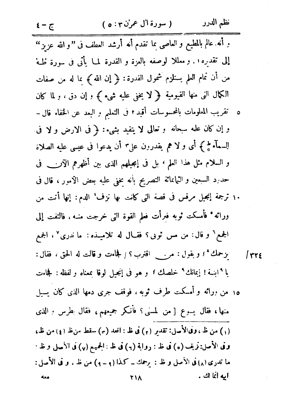 وأنه عالم بالمطيع والعاصي بما تقدم أنه أرشد العطف في {والله عزيز} لى تقديره، ومعللاً لوصفه بالعزة والقدرة لما يأتي في سورة طه من أن تمام العلم يستلزم شمول القدرة: {إن الله} بما له من صفات الكمال التي منها القيومية {لا يخفى عليه شيء} وإن دق، ولما كان تقريب المعلومات بالمحسوسات أقيد في التعليم والبعد عن الخفاء قال وإن كان علمه سبحانه وتعالى لا يتقيد بشيء: {في الأرض ولا في السماء *} أي ولا هم يقدرون على أن يدعوا في عيسى عليه الصلاة والسلام مثل هذا العلم، بل في إنجيلهم الذي بين أظهرهم الآن في حدود السبعين والثمانمائة التصريح بأنه يخفى عليه بعض الأمور، قال في ترجمة إنجيل مرقس في قصة التي كانت بها نزف الدم: إنها أتت من ورائه فأمسكت ثوبه فبرأت فعلم القوة التي خرجت منه، فالتفت إلى الجمع وقال: من مس ثوبي؟ فقال له تلاميذه: ما ندري، الجمع يزحمك، ويقول: من اقترب؟ فجاءت وقالت له الحق، فقال: يا ابنة! إيمانك خلصك؛ وهو في إنجيل لوقا بمعناه ولفظه: فجاءت من ورائه وأمسكت طرف ثوبه، فوقف جري دمها الذي كان يسيل منها، فقال يسوع من لمسني؟ فأنكر جميعهم، فقال بطرس والذي