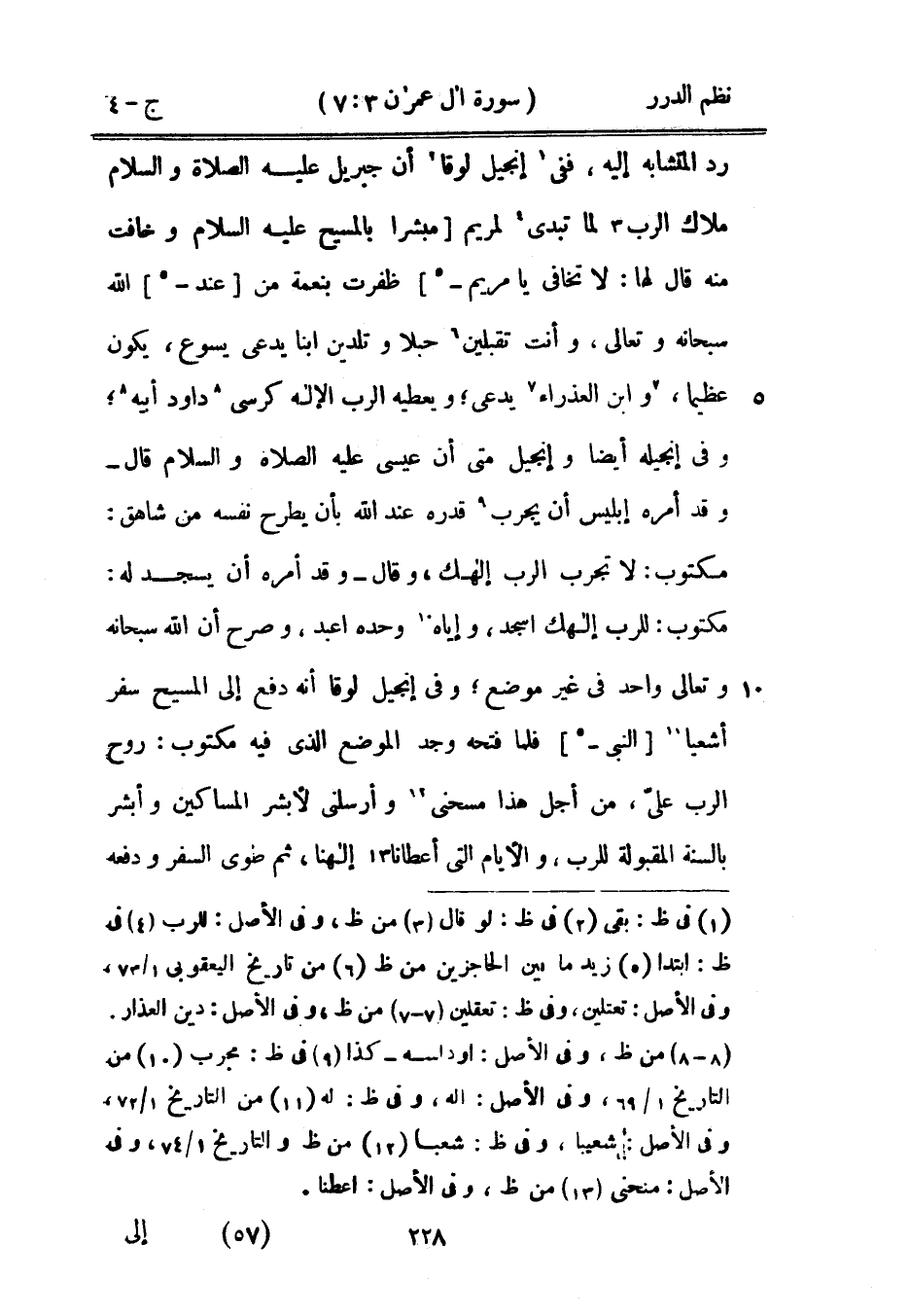 رد المتشابه إليه، ففي إنجيل لوقا أن جبريل عليه الصلاة والسلام ملاك الرب لما تبدى لمريم مبشراً بالمسيح عليه السلام وخافت منه قال لها: لا تخافي يا مريم ظفرت بنعمة من عند الله سبحانه وتعالى، وأنت تقبلين حبلاً وتلدين ابناً يدعى يسوع، يكون عظيماً، وابن العذراء يدعى؛ ويعطيه الرب الإله كرسي داود أبيه؛ وفي إنجيله أيضاً وإنجيل متى أن عيسى عليه الصلاة والسلام قال وقد أمره إبليس أن يجرب قدره عند الله بأن يطرح نفسه من شاهق: مكتوب: لا تجرب الرب إلهك، وقال وقد أمره أن يسجد له: مكتوب: للرب إلهك اسجد، وإياه وحده اعبد، وصرح أن الله سبحانه وتعالى واحد في غير موضع؛ وفي إنجيل لوقا أنه دفع إلى المسيح سفر أشعيا النبي فلما فتحه وجد الموضع الذي فيه مكتوب: روح الرب عليّ، من أجل هذا مسحني وأرسلني لأبشر المساكين وأبشر بالسنة المقبولة للرب، والأيام التي أعطانا إلهنا، ثم طوى السفر ودفعه