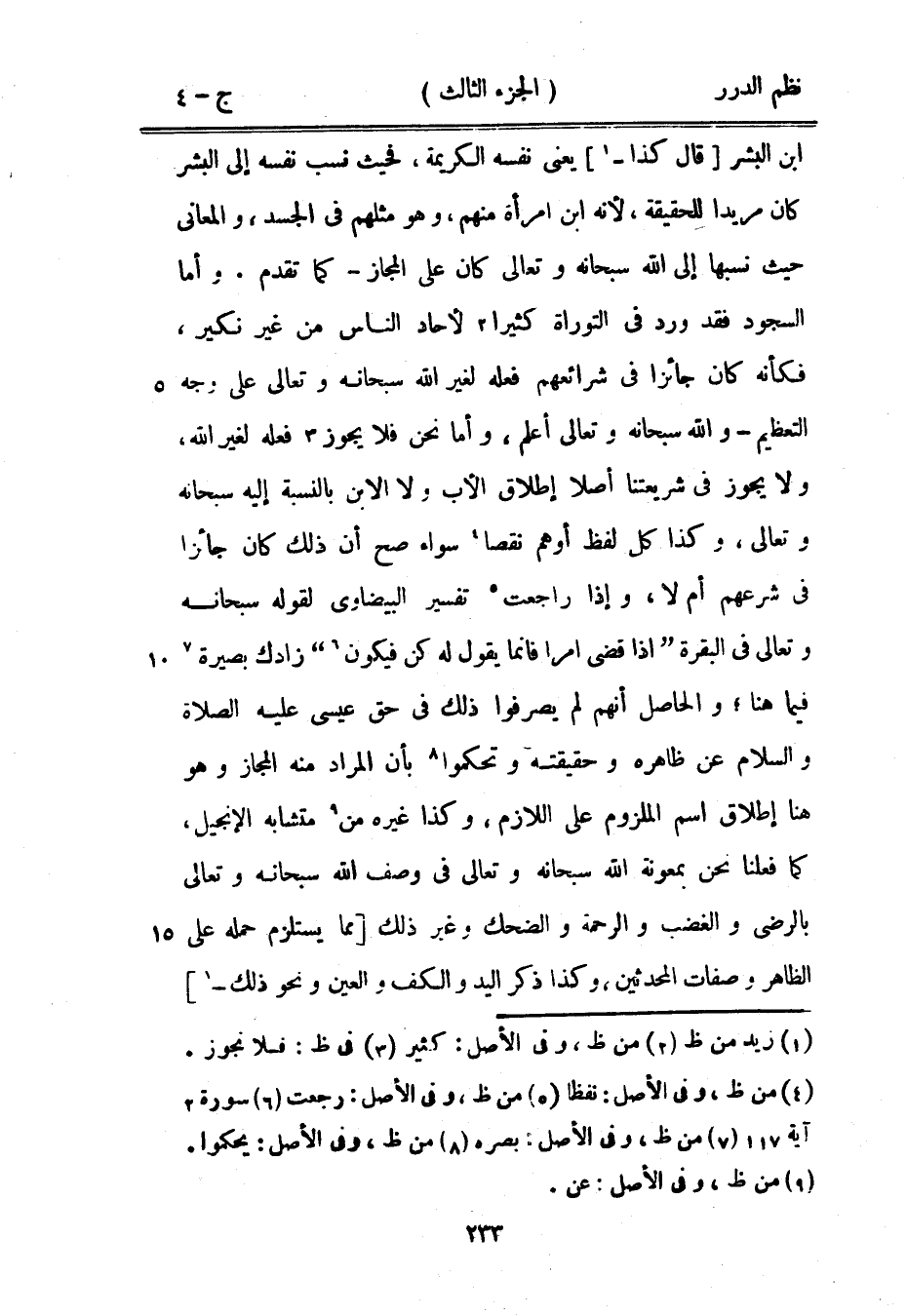 ابن البشر قال كذا يعني نفسه الكريمة، فحيث نسب نفسه إلى البشر كان مريداً للحقيقة، لأنه ابن امرأة منهم، وهو مثلهم في الجسد، والمعاني حيث نسبها إلى الله سبحانه وتعالى كان على المجاز كما تقدم. وأما السجود فقد ورد في التوراة كثيراً لأحاد الناس من غير نكير، فكأنه كان جائزاً في شرائعهم فعله لغير الله سبحانه وتعالى على وجه التعظيم والله سبحانه وتعالى أعلم، وأما نحن فلا يجوز فعله لغير الله، ولا يجوز في شريعتنا أصلاً إطلاق الأب ولا الابن بالنسبة إليه سبحانه وتعالى، وكذا كل لفظ أوهم نقصاً سواء صح أن ذلك كان جائزاً في شرعهم أم لا، وإذا راجعت تفسير البيضاوي لقوله سبحانه وتعالى في البقرة {إذا قضى أمراً فإنما يقول له كن فيكون} [البقرة: 117] زادك بصيرة فيما هنا؛ والحاصل أنهم لم يصرفوا ذلك في حق عيسى عليه الصلاة والسلام عن ظاهره وحقيقته وتحكموا بأن المراد منه المجاز وهو هنا إطلاق اسم الملزوم على اللازم، وكذا غيره من متشابه الإنجيل، كما فعلنا نحن بمعونة الله سبحانه وتعالى في وصف الله سبحانه وتعالى بالرضى والغضب والرحمة والضحك وغير ذلك مما يستلزم حمله على الظاهر وصفات المحدثين، وكذا ذكر اليد والكف والعين ونحو ذلك