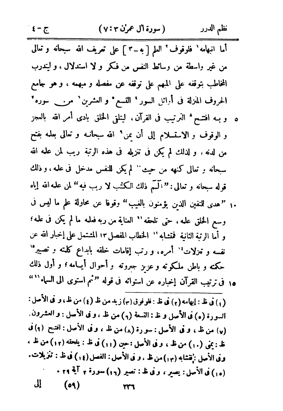 أما انبهامه فلوقوف العلم به على تعريف الله سبحانه وتعالى من غير واسطة من وسائط النفس من فكر ولا استدلال، وليتدرب المخاطب بتوقفه على المبهم على توقفه عن مفصله ومبهمه، وهو جامع الحروف المنزلة في أوائل السور التسع والعشرين من سوره وبه افتتح الترتيب في القرآن، ليتلقى الخلق بادي أمر الله بالعجز والوقوف والاستسلام إلى أن يمن الله سبحانه وتعالى بعلمه بفتح من لدنه، ولذلك لم يكن في تنزيله في هذه الرتبة ريب لمن علمه الله سبحانه وتعالى كنهه من حيث لم يكن للنفس مدخل في علمه، وذلك قوله سبحانه وتعالى: {آلم ذلك الكتاب لا ريب فيه} [البقرة: 1، 2] لمن علمه الله إياه {هدى للمتقين الذين يؤمنون بالغيب} [البقرة: 2، 3] وقوفاً عن محاولة علم ما ليس في وسع الخلق علمه، حتى تلحقه العنايه من ربه فعلمه ما لم يكن في علمه؛ وأما الرتبة الثانية فمتشابه الخطاب المفصل المشتمل على إخبار الله عن نفسه وتنزيلات أمره، ورتب إقامات خلقه بإبداع كلمته وتصيير حكمته وباطن ملكوته وعزيز جبروته وأحوال أيامه؛ وأول ذلك في ترتيب القرآن إخباره عن استوائه في قوله: