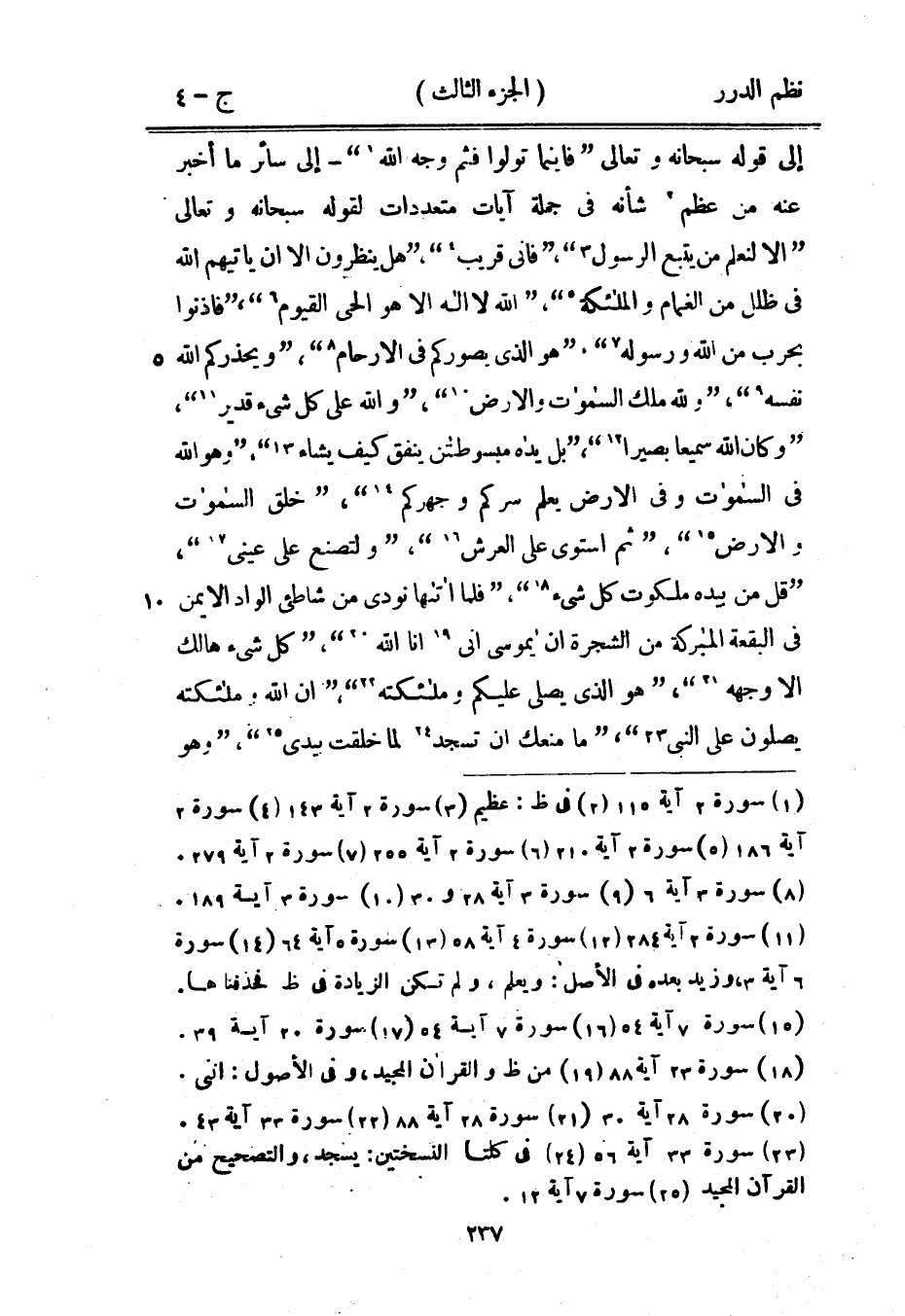 إلى قوله سبحانه وتعالى {فأينما تولوا فثم وجه الله} [لبقرة: 115] إلى سائر ما أخبر عنه من عظم شأنه في جملة آيات متعددات لقوله سبحانه وتعالى {إلا لنعلم من يتبع الرسول} [البقرة: 143] ، {فإني قريب} [البقرة: 186] {هل ينظرون إلا أن يأتيهم الله في ظل من الغمام والملائكة} [البقرة: 210] ، {الله لا إله إلا هو الحي القيوم} [البقرة: 255] {فأذنوا بحرب من الله ورسوله} [البقرة: 279] ، {هو الذي يصوركم في الأرحام} [آل عمران: 6] ، {ويحذركم الله نفسه} [آل عمران: 128] ، {ولله ملك السماوات والأرض} [آل عمران: 189] ، {والله على كل شيء قدير} [البقرة: 284] ، {وكان الله سميعاً بصيراً} [النساء: 85] ، {بل يداه مبسوطتان ينفق كيف يشاء} [المائده: 64] ، {وهو الله في السماوات وفي الأرض يعلم سركم وجهركم} [الأنعام: 3] ، {خلق السماوات والأرض} [الأعراف: 54] ، {ثم استوى على العرش} [الأعراف: 54] ، {ولتصنع على عيني} [طه: 39] ، {قل من بيده ملكوت كل شيء} [المؤمنون: 88] ، {فلما أتاها نودي من شاطئ الواد الأيمن في البقعة المباركة من الشجرة أن يا موسى إني أنا الله} [القصص: 30] ، {كل شيء هالك إلا وجهه} [القصص: 88] ، {هو الذي يصلي عليكم وملائكته} [الأحزاب: 43] ، {إن الله وملائكته يصلون علىلنبي} [الأحزاب: 56] ، {ما منعك أن تسجد لما خلقت بيدي} [الأعراف: 12] ، {وهو