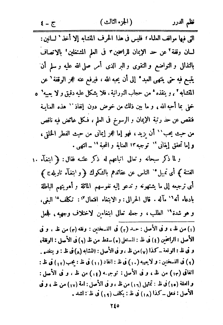 التي فيها مواقف العلماء؛ فليس في هذا الحرف المتشابه إلا أخذ لسانين: لسان وقفة عن حد الإيمان للراسخين في العلم المشتغلين بالاتصاف بالتذلل والتواضع والتقوى والبر الذي أمر صَلَّى اللهُ عَلَيْهِ وَسَلَّمَ أن يتبع فيه حتى ينتهي العبد إلى أن يحبه الله، فيرفع عنه عجز الوقفه عن المتشابه، وينقذه من حجاب النورانية، فلا يشكل عليه دقيق ولا يعييه خفي بما أحبه الله، وما بين ذلك من خوض دون إنقاذ هذه العناية فنقص عن حد رتبة الإيمان والرسوخ في العلم، فكل خائض فيه ناقص من حيث يحب أن يزيد، فهو إما عجز إيماني من حيث الفطر الخلقي، وإما تحقق إيقاني توجبه العناية والمحبة انتهى.