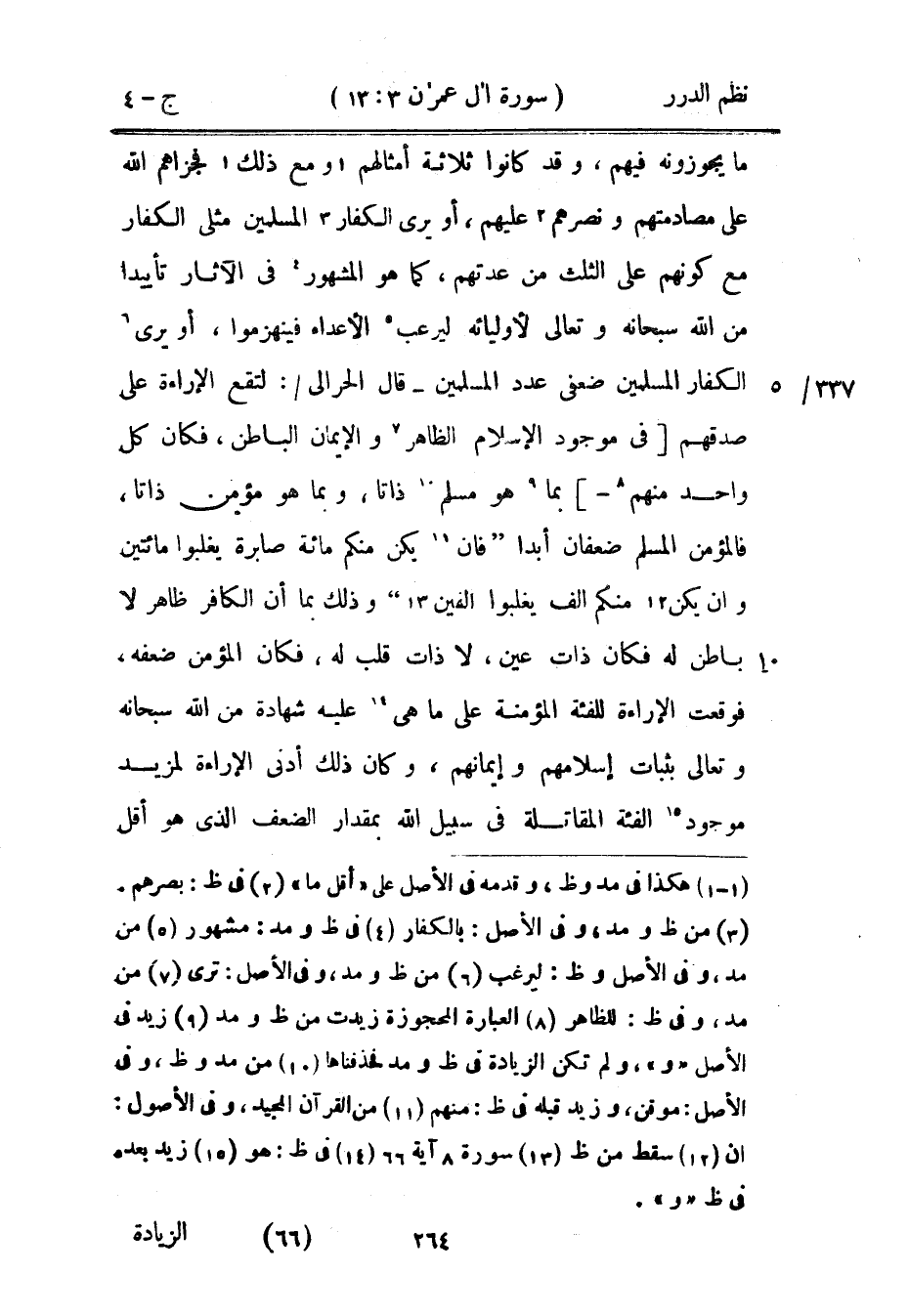 ما يجوزونه فيهم، وقد كانوا ثلاثة أمثالهم ومع ذلك فجزاهم الله على مصادمتهم ونصرهم عليهم، أو يرى الكفار المسلمين مثلي الكفار مع كونهم على الثلث من عدتهم، كما هو المشهور في الآثار تأييداً من الله سبحانه وتعالى لأوليائه ليرعب الأعداء فينهزموا، أو يرى الكفار المسلمين ضعفي عدد المسلمين قال الحرالي: لتقع الإراءة على صدقهم في موجود الإسلام الظاهر والإيمان الباطن، فكان كل واحد منهم بما هو مسلم ذاتاً، وبما هو مؤمن ذاتاً، فالمؤمن المسلم ضعفان أبداً {فإن يكن منكم مائة صابرة يغلبوا مائتين وإن يكن منكم ألف يغلبوا ألفين} [الأنفال: 66] وذلك بما أن الكافر ظاهر لا باطن له فكان ذات عين، لا ذات قلب له، فكان المؤمن ضعفه، فوقعت الإراءة للفئة المؤمنة على ما هي عليه شهادة من الله سبحانه وتعالى بثبات إسلامهم وإيمانهم، وكان ذلك أدنى الإراءة لمزيد موجود الفئة المقاتلة في سبيل الله بمقدار الضعف الذي هو أقل