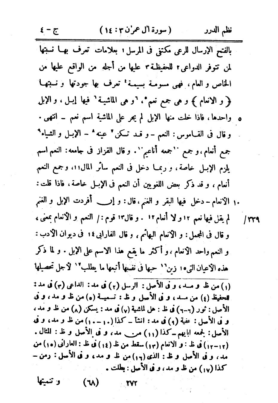 بالفتح الإرسال للرعي مكتفي في المرسل بعلامات تعرف بها نسبتها لمن تتوفر الدواعي للحفيظة عليها من أجله من الواقع عليها من الخاص والعام، فهي مسومة بسيمة تعرف بها جودتها ونسبتها {والأنعام} وهي جمع نعم، وهي الماشية فيها إبل، والإبل واحدها، فإذا خلت منها الإبل لم يجر على الماشية اسم نعم - انتهى. وقال في القاموس: النعم - وقد تسكن عينه - الإبل والشياء جمع أنعام، وجمع جمعه أناعيم. وقال القزاز في جامعه: النعم اسم يلزم الإبل خاصة، وربما دخل في النعم سائر المال، وجمع النعم أنعام، وقد ذكر بعض اللغويين أن النعم في الإبل خاصة، فإذا قلت: الأنعام - دخل فيها البقر والغنم، قال: وإن أفردت الإبل والغنم لم يقل فيها نعم ولا أنعام. وقال قوم: النعم والأنعام بمعنى، وقال في المجمل: والأنعام البهائم، وقال الفارابي في ديوان الأدب: والنعم واحد الأنعام، وأكثر ما يقع هذا الاسم على الإبل. ولما ذكر هذه الأعيان التي زين حبها في نفسها أتبعها ما يطلب لأجل تحصيلها