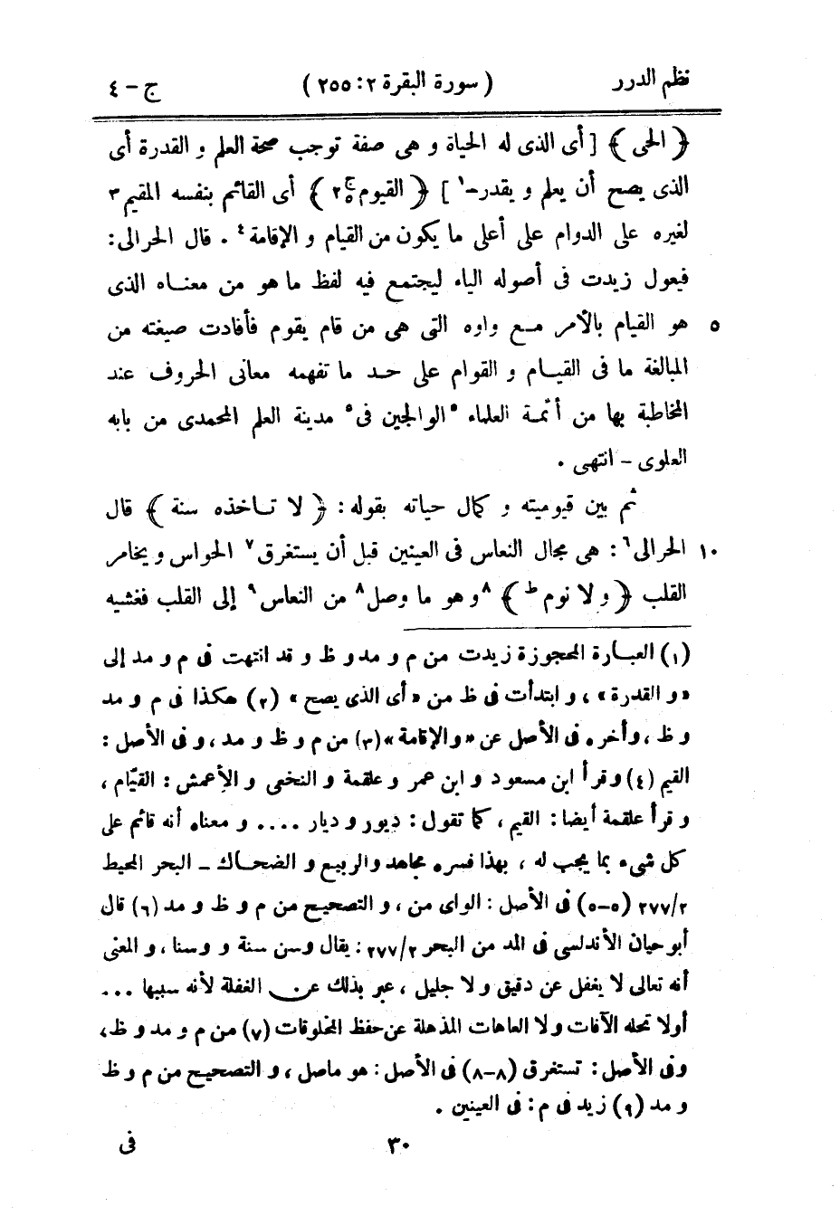 {الحي} أي الذي له الحياة وهي صفة توجب صحة العلم والقدرة أي الذي يصح أن يعلم ويقدر {القيوم} أي القائم بنفسه المقيم لغيره على الدوام على أعلى ما يكون من القيام والإقامة. قال الحرالي: فيعول زيدت في أصوله الياء ليجتمع فيه لفظ ما هو من معناه الذي هو القيام بالأمر مع واوه التي هي من قام يقوم فأفادت صيغته من المبالغة ما في القيام والقوام على حد ما تفهمه معاني الحروف عند المخاطبة بها من أئمة العلماء الوالجين في مدينة العلم المحمدي من بابه العلوي - انتهى.