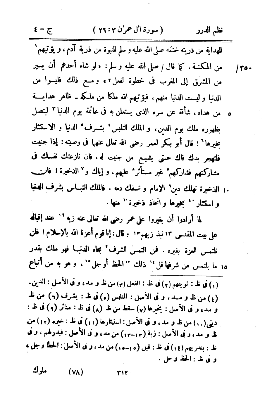 «لو شاء أحدهم أن يسير من المشرق إلى المغرب في خطوة لفعل» ومع ذلك فليسوا من الدنيا وليست الدنيا منهم، فيؤتيهم الله ملكاً من ملكه - ظاهر هداية من هداه، شأفة عن سره الذي يستعلن به في خاتمة يوم الدنيا ليتصل بظهوره ملك يوم الدين، والملك التلبس بشرف الدنيا والاستئثار بخيرها؛ قال أبو بكر لعمر رضي الله تعالى عنهما في وصيته: إذا جنيت فلتهجر يدك فاك حتى يشبع من جنيت له، فإن نازعتك نفسك في مشاركتهم فشاركهم غير مستأثر عليهم، وإياك والذخيرة! فإن الذخيرة تهلك دين الإمام وتسفك دمه، فالملك التباس بشرف الدنيا واستئثار بخيرها واتخاذ ذخيرة منها.