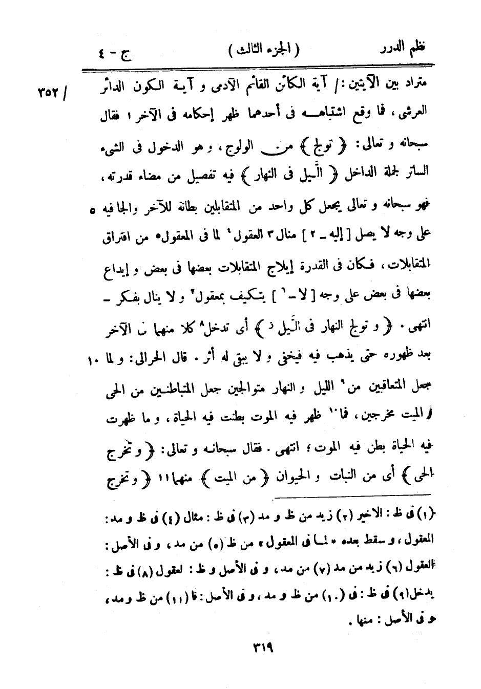 متراد بين الآيتين: آية الكائن القائم الآدمي وآية الكون الدائر العرشي، فما وقع اشتباهه في أحدهما ظهر إحكامه في الآخر فقال سبحانه وتعالى: {تولج} من الولوج، وهو الدخول في الشيء الساتر لجملة الداخل {الَّيل في النهار} فيه تفصيل من مضاء قدرته، فهو سبحانه وتعالى يجعل كل واحد من المتقابلين بطانة للآخر والجاً فيه على وجه لا يصل إليه منال العقول لما في المعقول من افتراق المتقابلات، فكان في القدرة إيلاج المتقابلات بعضها في بعض وإيداع بعضها في بعض على وجه لا يتكيف بمعقول ولا ينال بفكر - انتهى. {وتولج النهار في الَّيل} أي تدخل كلاً منهما في الآخر بعد ظهوره حتى يذهب فيه فيخفى ولا يبقى له أثر. قال الحرالي: ولما جعل المتعاقبين من الليل والنهار متوالجين جعل المتباطنين من الحي والميت مخرجين، فما ظهر فيه الموت بطنت فيه الحياة، وما ظهرت فيه الحياة بطن فيه الموت؛ انتهى. فقال سبحانه وتعالى: {وتخرج الحي} أي من النبات والحيوان {من الميت} منهما {وتخرج