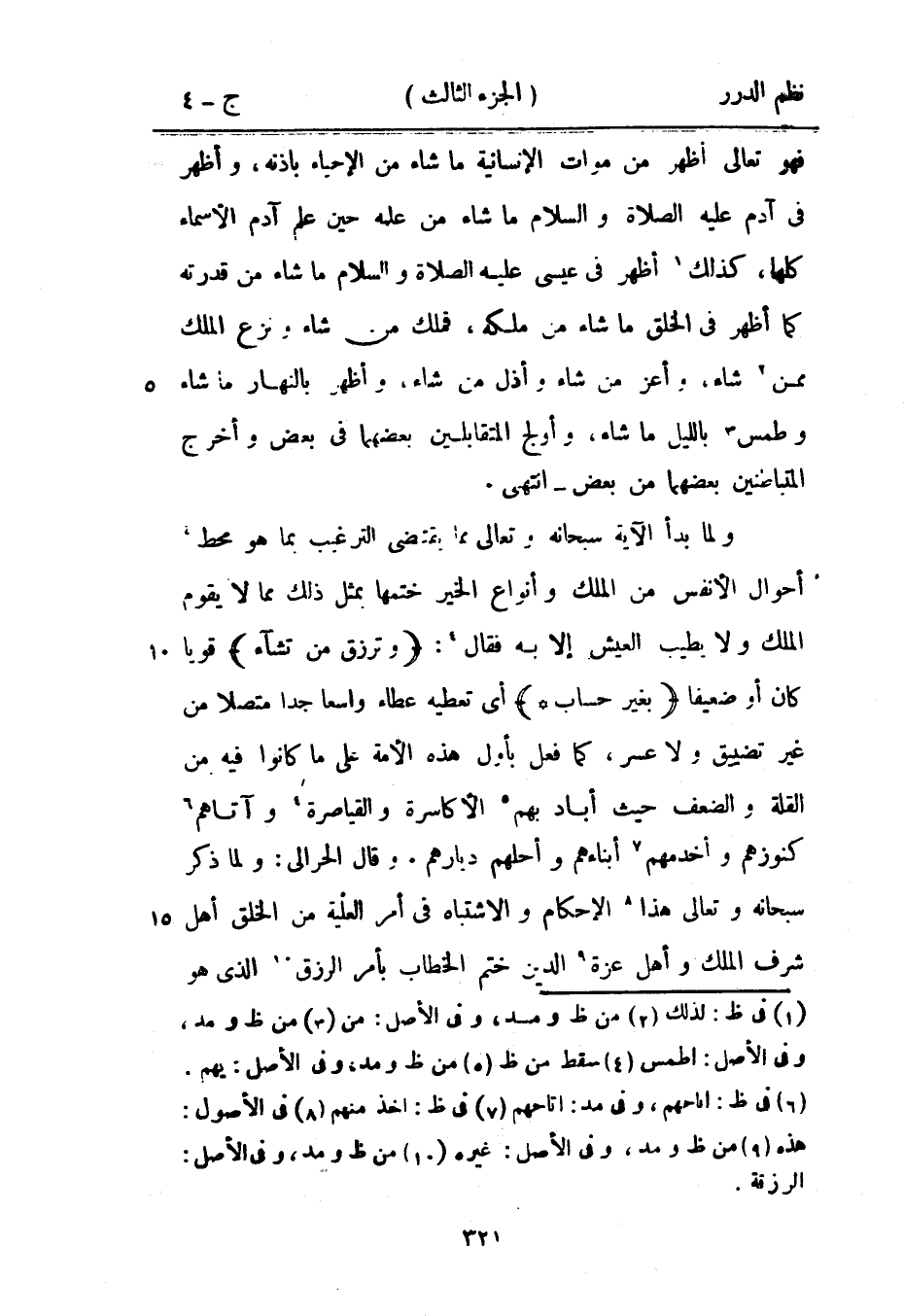 فهو تعالى أظهر من موات الإنسانية ما شاء من الإحياء بإذنه، وأظهر في آدم عليه الصلاة والسلام ما شاء من علمه حين علم آدم الأسماء كلها كذلك أظهر في عيسى عليه الصلاة والسلام ما شاء من قدرته كما أظهر في الخلق ما شاء من ملكه، فملك من شاء ونزع الملك ممن شاء، وأعز من شاء وأذل من شاء، وأظهر بالنهار ما شاء وطمس بالليل ما شاء، وأولج المتقابلين بعضهما في بعض وأخرج المتباطنين بعضهما من بعض - انتهى.