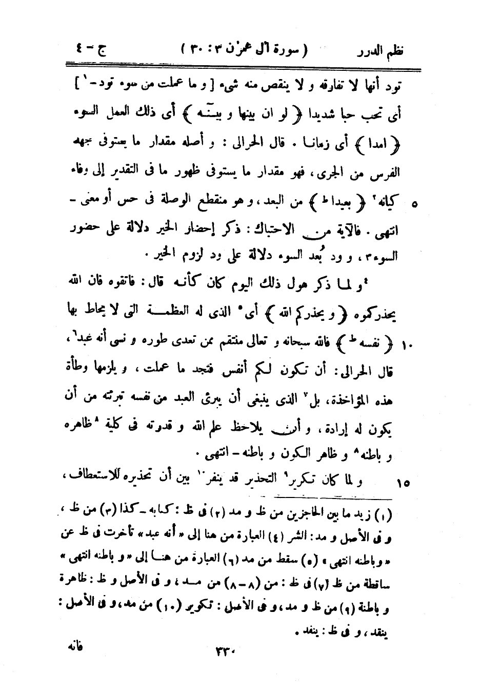 تود أنها لا تفارقه ولا ينقص منه شيء [وما عملت من سوء {تود} أي تحب حباً شديداً {ولو أن بينها وبينه} أي ذلك العمل السوء {أمداً} أي زماناً. قال الحرالي: وأصله مقدار ما يستوفي جهد الفرس من الجري، فهو مقدار ما يستوفي ظهور ما في التقدير إلى وفاء كيانه {بعيداً} من البعد، وهو منقطع الوصلة في حس أو معنى - انتهى. فالآية من الاحتباك: ذكر إحضار الخير دلالة على حضور السوء، وود بعد السوء دلالة على ود لزوم الخير.