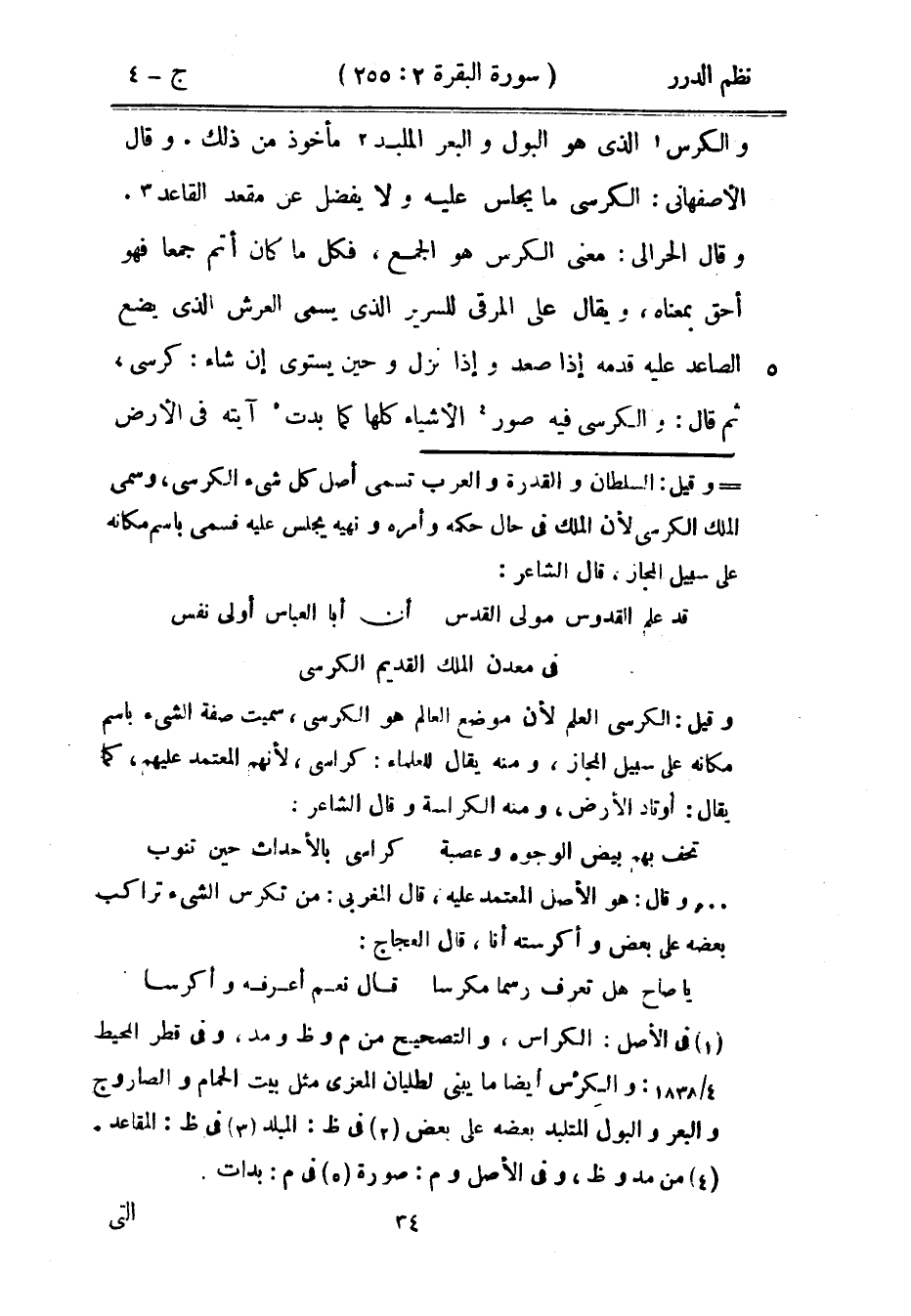 والكرس الذي هو البول والبعر الملبد مأخوذ من ذلك. وقال الأصفهاني: الكرسي ما يجلس عليه ولا يفضل عن مقعد القاعد. وقال الحرالي: معنى الكرس هو الجمع، فكل ما كان أتم جمعاً فهو أحق بمعناه، ويقال على المرقى للسرير الذي يسمى العرش الذي يضع الصاعد عليه قدمه إذا صعد وإذا نزل وحين يستوي إن شاء: كرسي، ثم قال: والكرسي فيه صور الأشياء كلها كما بدت آيته في الأرض