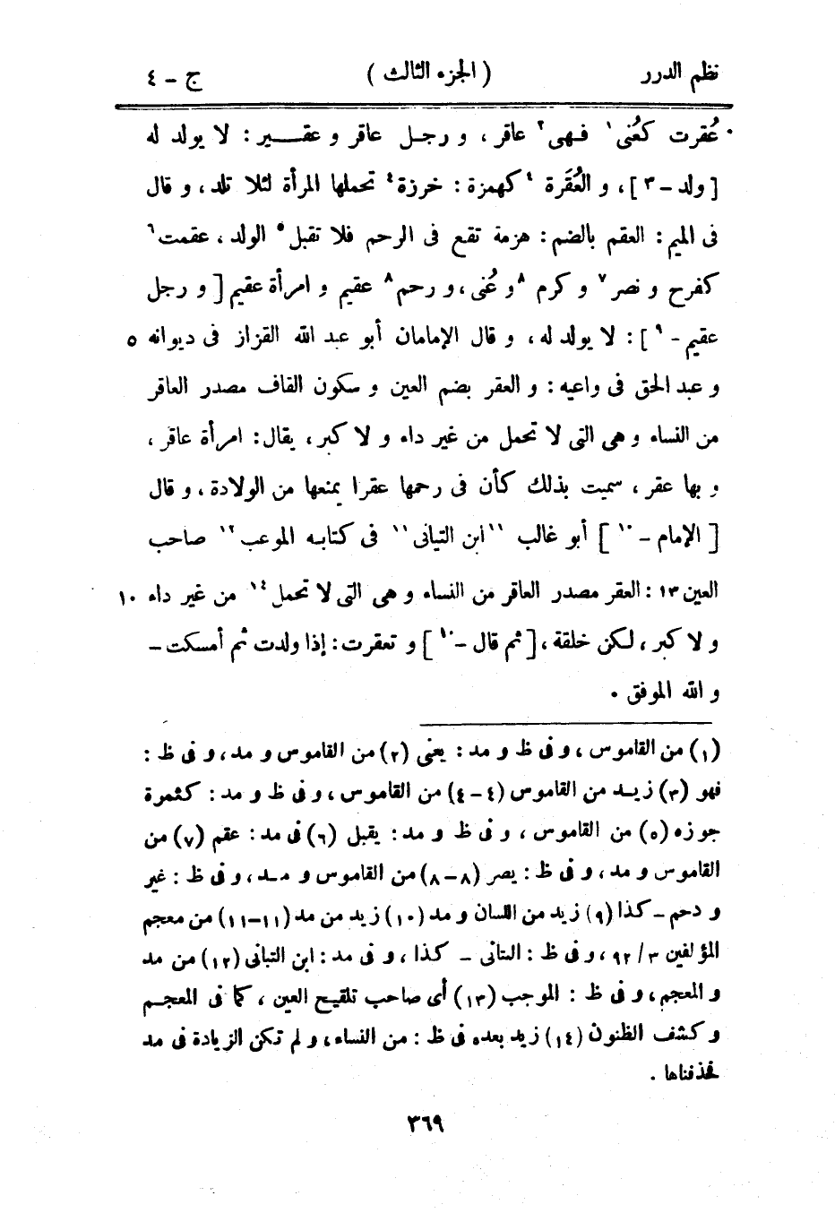 عُقرت كعُنى فهي عاقر، ورجل عاقر وعقير: لا يولد له ولد، والعُقَرة كهمزة: خرزة تحملها المرأة لئلا تلد، وقال في الميم: العقم بالضم: هزمة تقع في الرحم فلا تقبل الولد، عقمت كفرح ونصر وكرم وعُنى، ورحم عقيم وامرأة عقيم ورجل عقيم: لا يولد له، وقال الإمامان أبو عبد الله القزاز في ديوانه وعبد الحق في واعيه: والعقر بضم العين وسكون القاف مصدر العاقر من النساء وهي التي لا تحمل من غير داء ولا كبر، يقال: الإمام أبو غالب «ابن التياني» في كتابه الموعب صاحب [تلقيح] العين: العقر مصدر العاقر من النساء وهي التي لا تحمل من غير داء ولا كبر، لكن خلقة، ثم قال وتعقرت: إذا ولدت ثم أمسكت - والله الموفق.