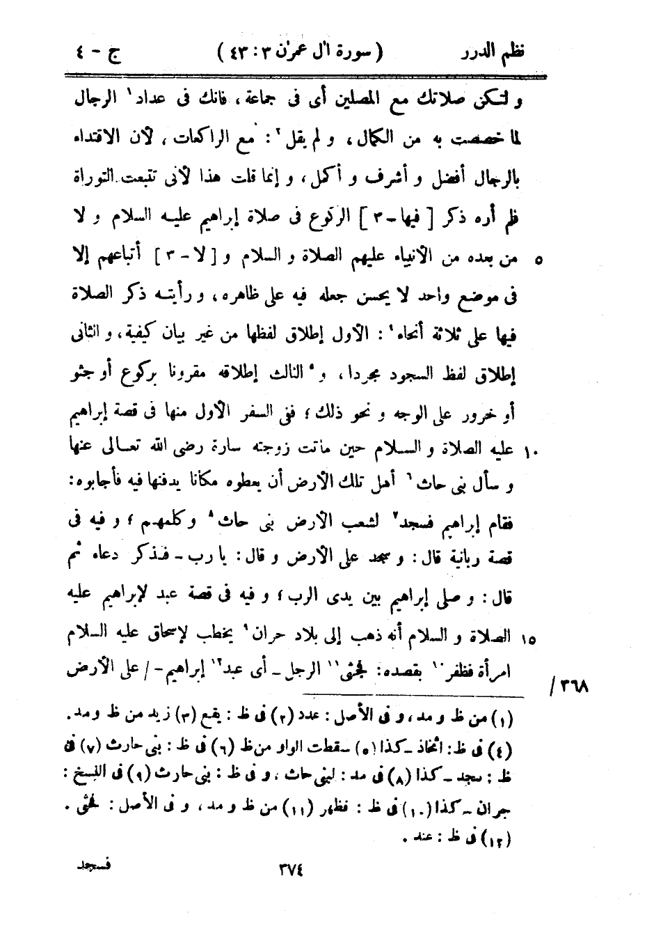 ولتكن صلاتك مع المصلين أي في جماعة، فإنك في عداد الرجال لما خصصت به من الكمال، ولم يقل: مع الراكعات، لأن الاقتداء بالرجال أفضل وأشرف وأكمل، وإنما قلت هذا لأني تتبعت التوراة فلم أره ذكر فيها الركوع في صلاة إبراهيم عليه السلام ولا من بعده من الأنبياء عليهم الصلاة والسلام ولا أتباعهم إلا في موضع واحد لا يحسن جعله فيه على ظاهره، ورأيته ذكر الصلاة فيها على ثلاثة أنحاء: الأول إطلاق لفظها من غير بيان كيفية، والثاني إطلاق لفظ السجود مجرداً، والثالث إطلاقه مقروناً بركوع أو جثو أو خرور على الوجه ونحو ذلك؛ ففي السفر الأول منها في قصة إبراهيم عليه الصلاة والسلام حين ماتت زوجته سارة رضي الله تعالى وسأل بني حاث أهل تلك الأرض أن يعطوه مكاناً يدفنها فيه فأجابوه: فقام إبراهيم فسجد لشعب الأرض بني حاث وكلمهم؛ وفيه في قصة ربانية قال: وسجد على الأرض وقال: يا رب - فذكر دعاء ثم قال: وصلى إبراهيم بين يدي الرب؛ وفيه في قصة عبد لإبراهيم عليه الصلاة والسلام أنه ذهب إلى بلاد حران يخطب لإسحاق عليه السلام امرأة فظفر بقصده: فجثا الرجل - أي عبد إبراهيم - على الأرض