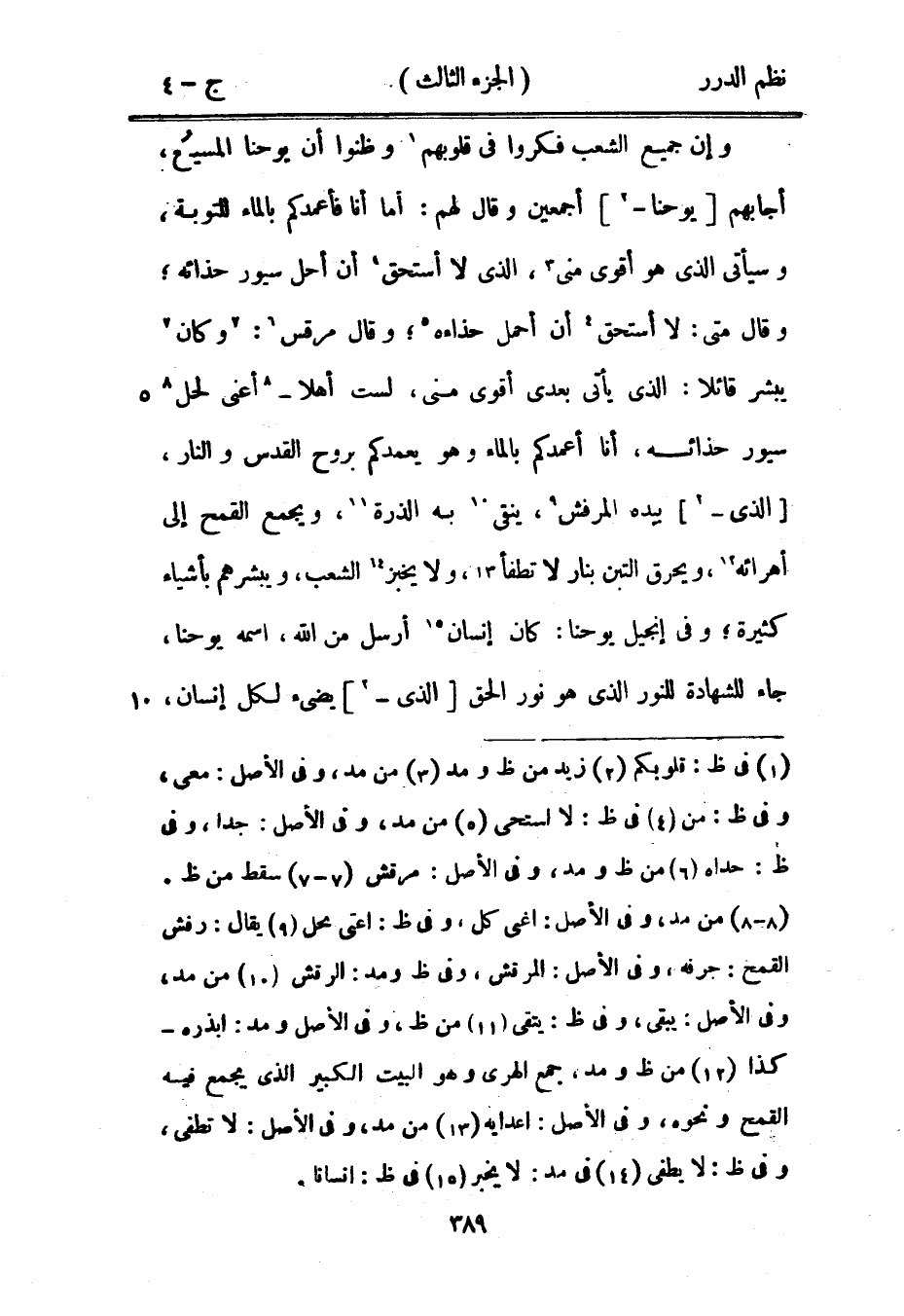 وإن جميع الشعب فكروا في قلوبهم وظنوا أن يوحنا المسيح، أجابهم يوحنا أجمعين وقال لهم: أما أنا فأعمدكم بالماء للتوبة، وسيأتي الذي هو أقوى من الذي لا أستحق أن أحل سيور حذائه؛ وقال متى: لا أستحق أن أحمل حذاءه؛ وقال مرقس: وكان يبشر قائلاً: الذي يأتي بعدي أوقى مني، لست أهلاً - أعني لحل سيور حذائه، أنا أعمدكم بالماء وهو يعمدكم بروح القدس والنار، الذي بيده المرفش، ينقي به الذرة، ويجمع القمح إلى أهرائه، ويحرق التبن بناء لا تطفأ، ولا يخبز الشعب، ويبشرهم بأشياء كثيرة؛ وفي إنجيل يوحنا: كان إنسان أرسل من الله، اسمه يوحنا، جاء للشهادة للنور الذي هو نور الحق الذي يضيء لكل إنسان،