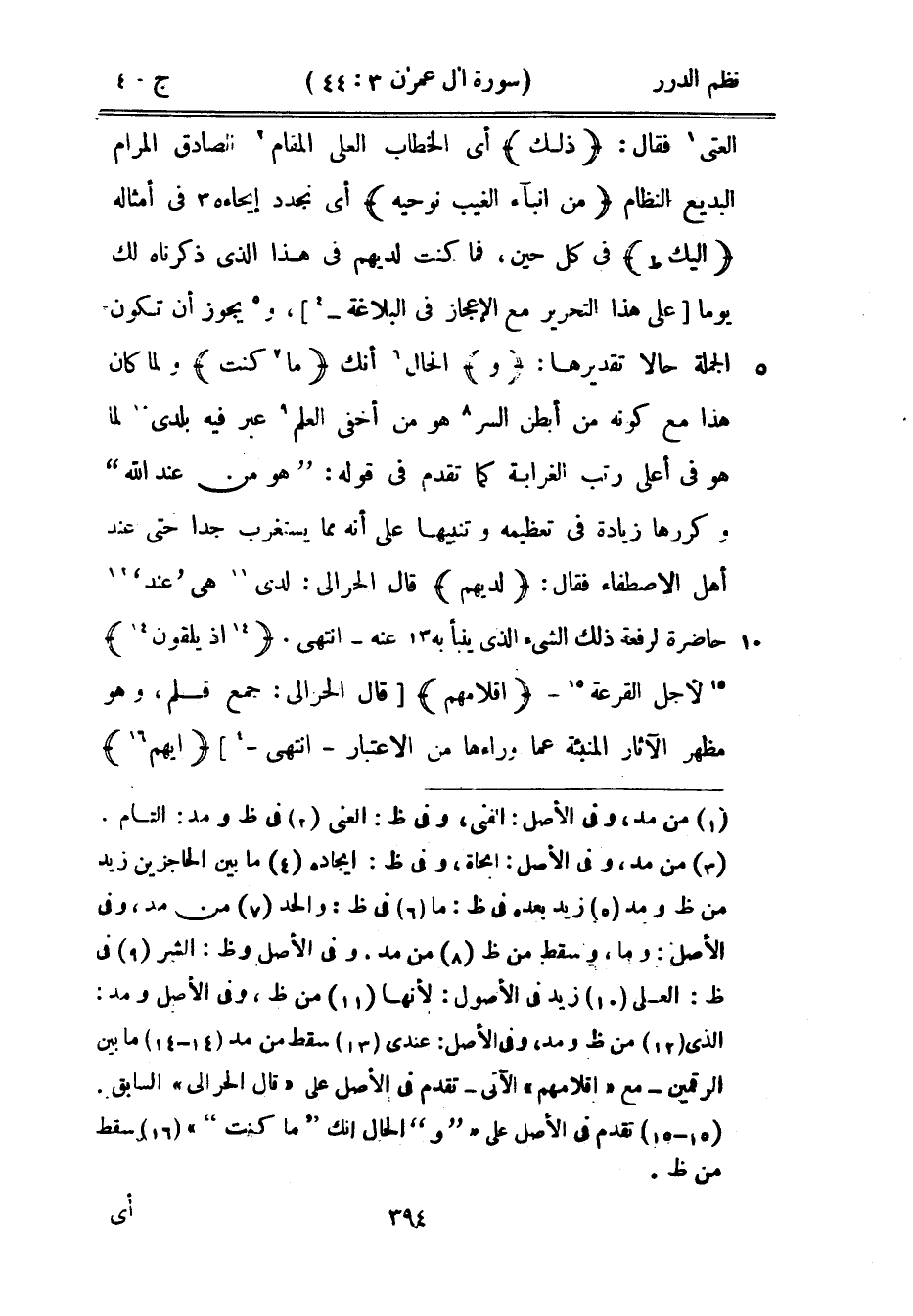 العتي فقال: {ذلك} أي الخطاب العلي المقام الصادق المرام البديع النظام {من أنباء الغيب نوحيه} أي نجدد إيحاءه في أمثاله {إليك} في كل حين فما كنت لديهم في هذا الذي ذكرناه لك يوماً على هذا التحرير مع الإعجاز في البلاغة ويجوز أن تكون الجملة حالاً تقديرها: {و} الحال أنك {ما كنت} ولما كان هذا مع كونه من أبطن السر هو من أخفى العلم عبر فيه بلدي لما هو في أعلى رتب الغرابة كما تقدم في قوله: {هو من عند الله} وكررها زيادة في تعظيمه وتنبيهاً على أنه مما يستغرب جداً حتى عند أهل الاصطفاء فقال: {لديهم} قال الحرالي: لدى هي عند حاضرة لرفعة ذلك الشيء الذي ينبأ به عنه - انتهى. {إذ يلقون} لأجل القرعة - {أقلامهم} قال الحرالي: جمع قلم، وهو مظهر الآثار المنبئة عما وراءها من الاعتبار - انتهى {أيهم}
